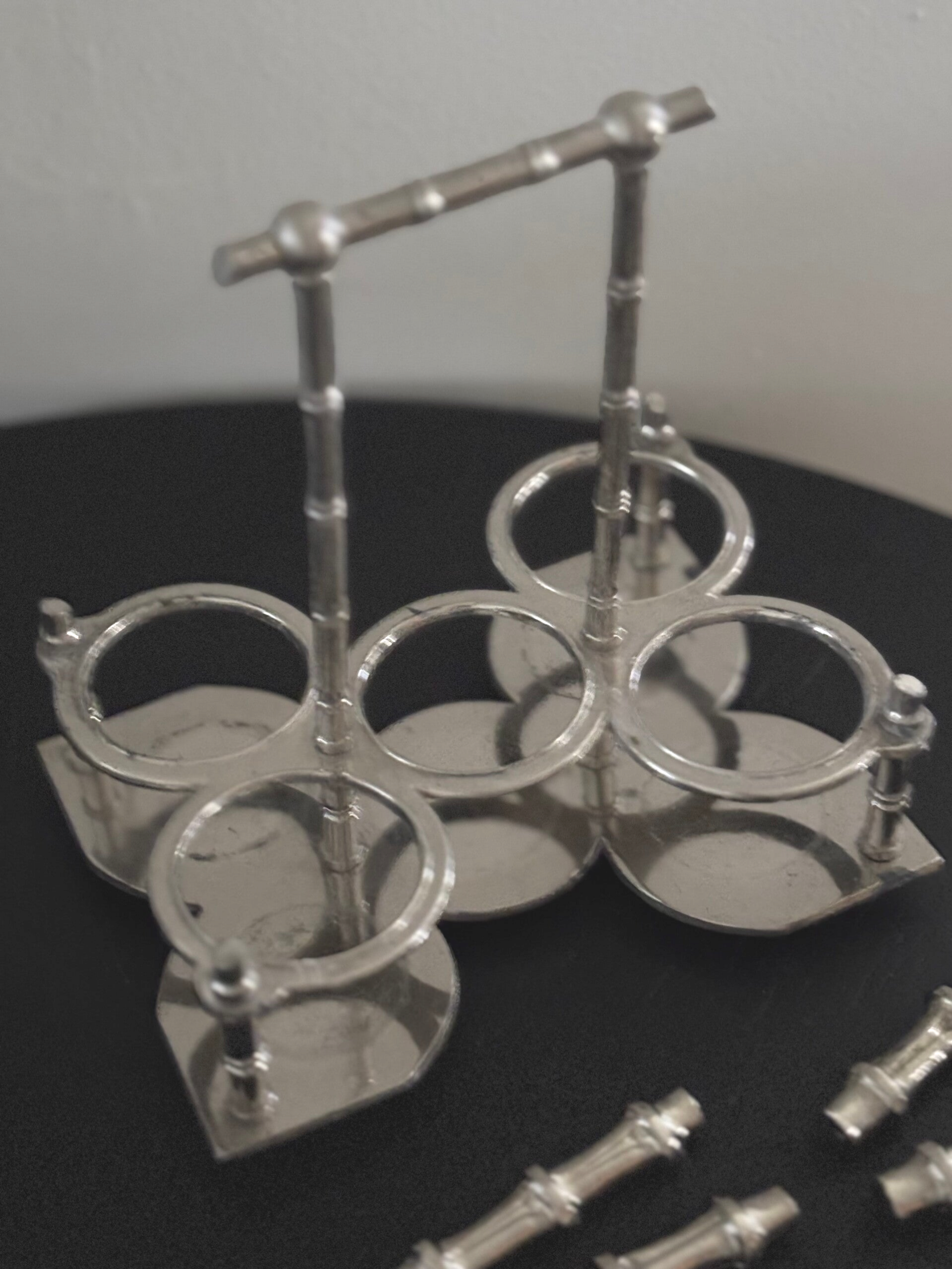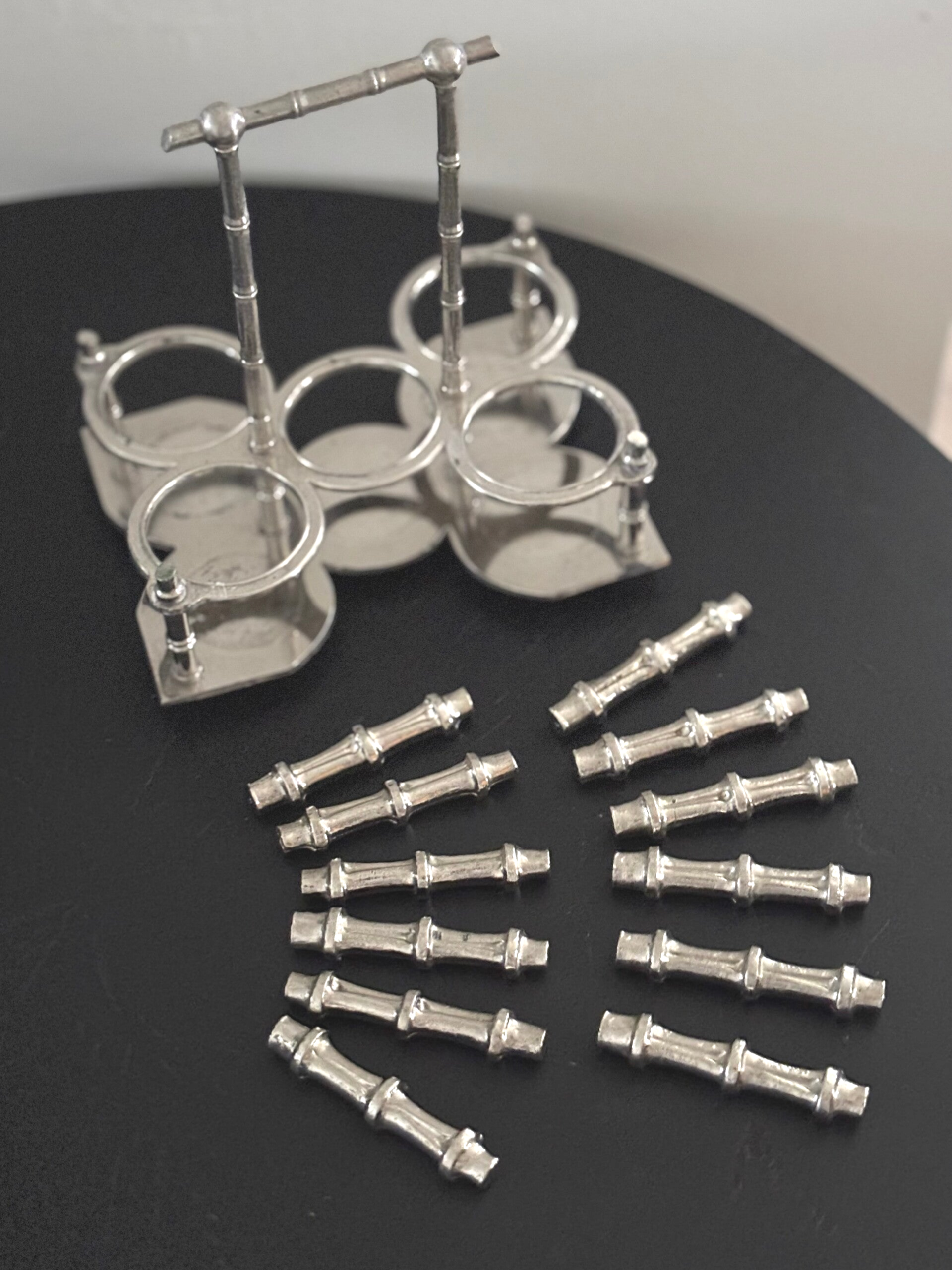Stylish silver-plated set featuring an elegant egg rack and twelve knife rests with a bamboo pattern. A refined addition to any beautifully set table.