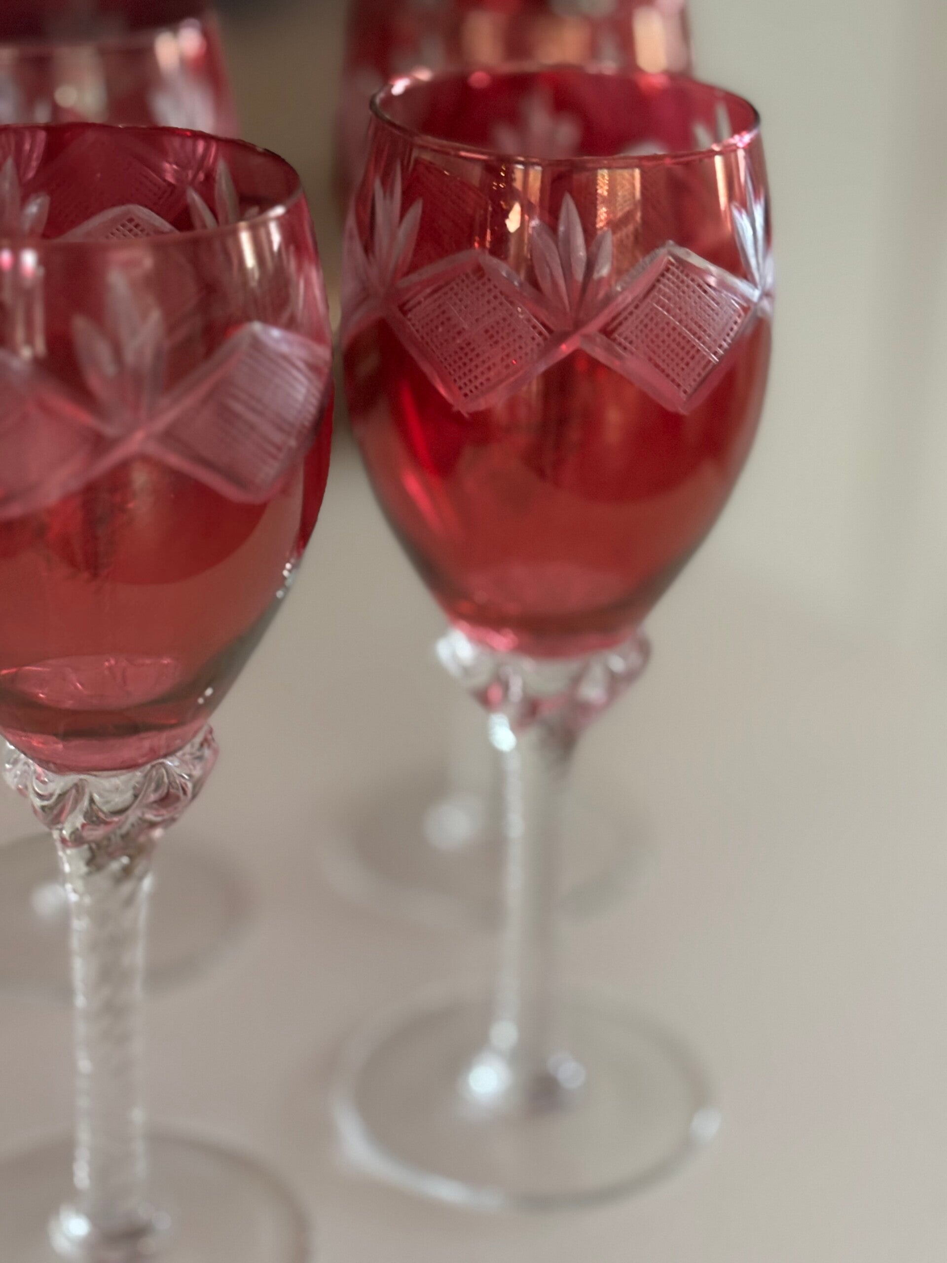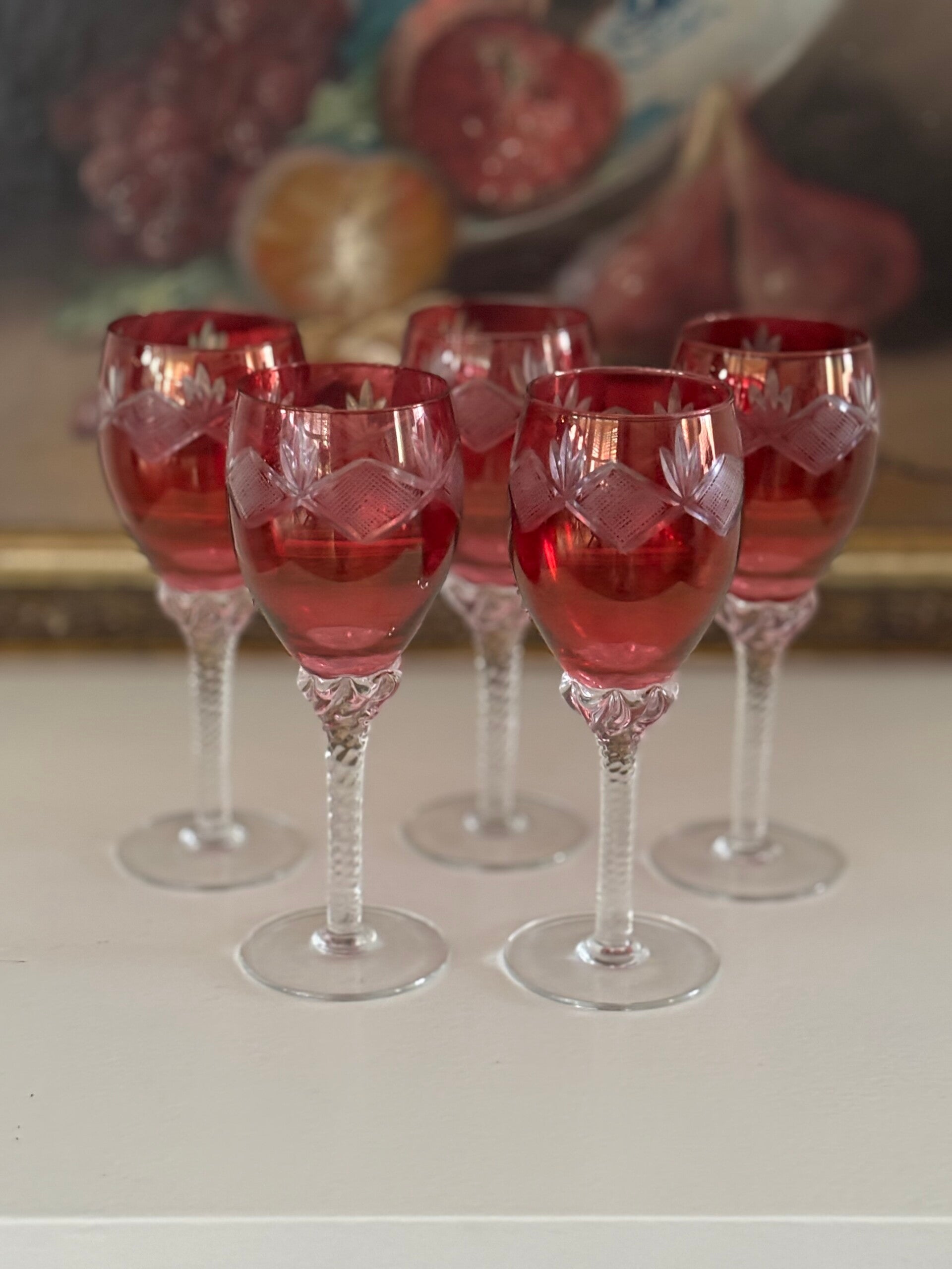 An elegant set of 5 Bohemian wine or port glasses with twisted stems and beautifully cut detailing. The rich wine-red colour makes them a true eye-catcher on any table setting. Handmade pieces; stem thickness may vary slightly. Dimensions: 15.2 x 6 cm.