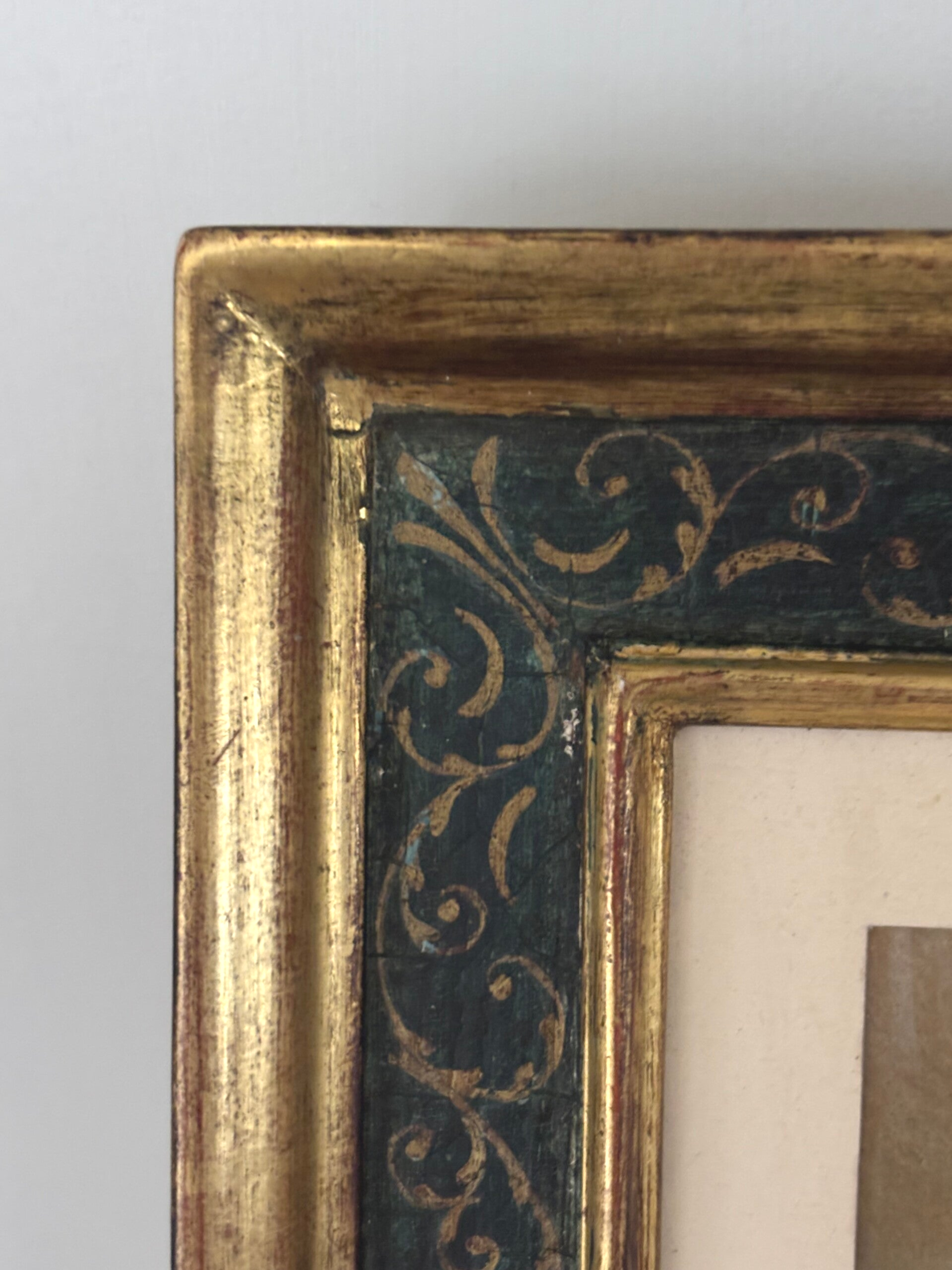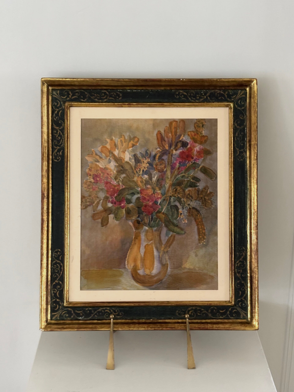 Geschilderd stilleven op paneel met een sierlijke lijst voorzien van vergulde details. Een charmant kunstwerk in mooie vintage staat. Afmetingen inclusief lijst: 43,3 x 37,3 cm.