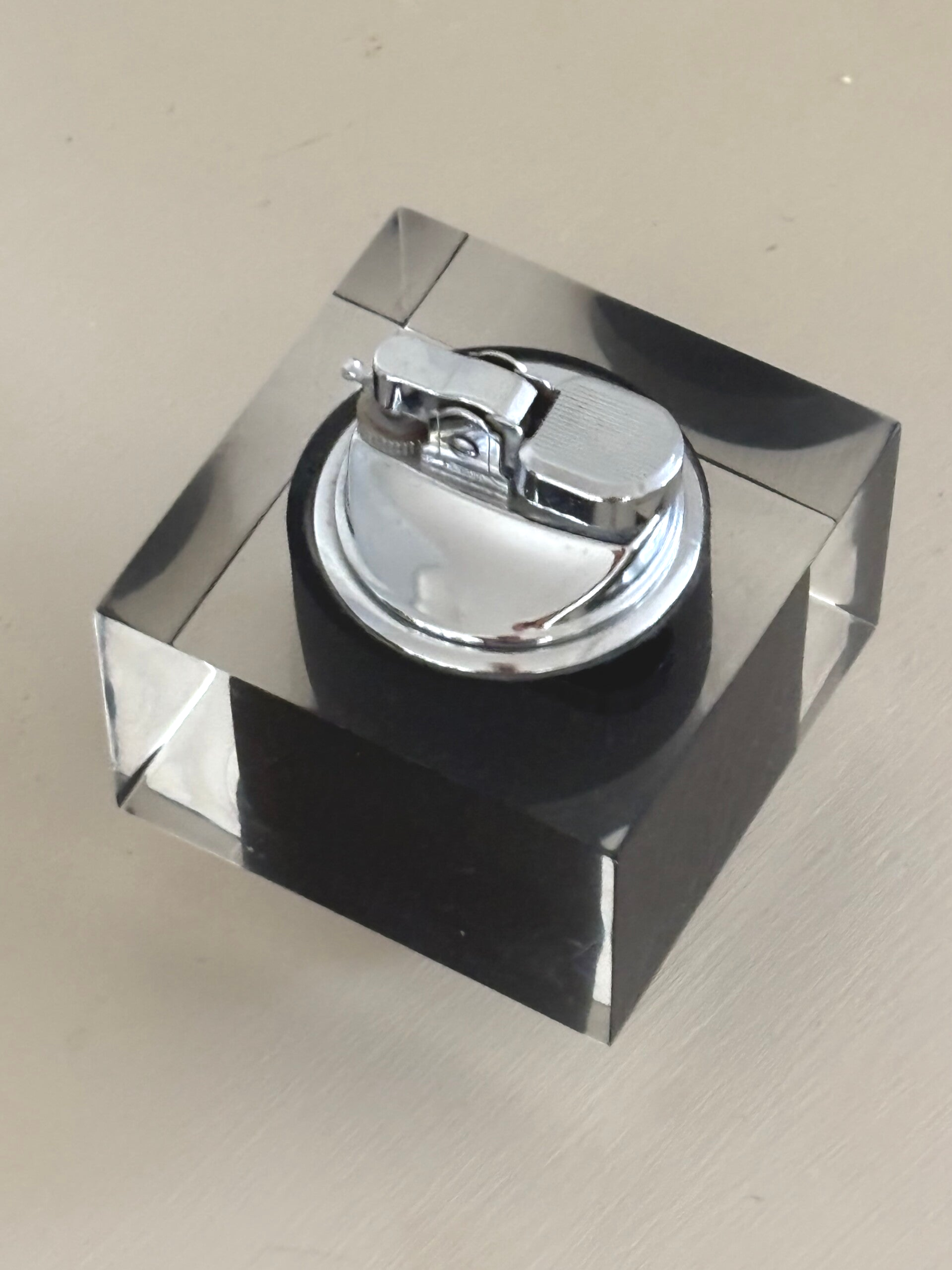 Stylish 1960 design table lighter, a timeless accent for desk or living room. An elegant collector’s piece; it likely needs to be refilled. Dimensions: 7 x 8 cm.