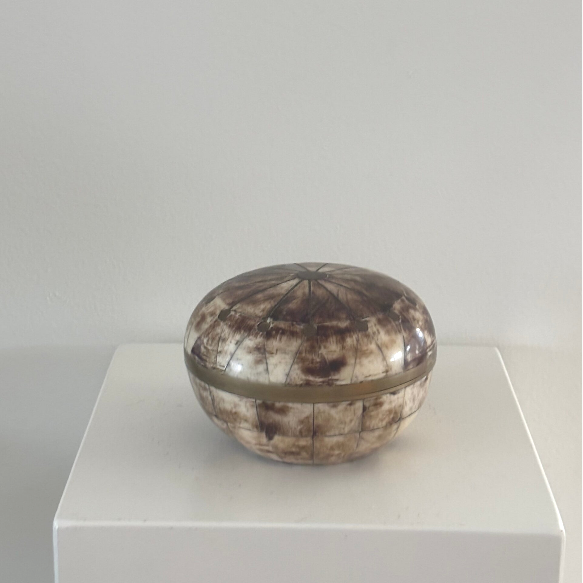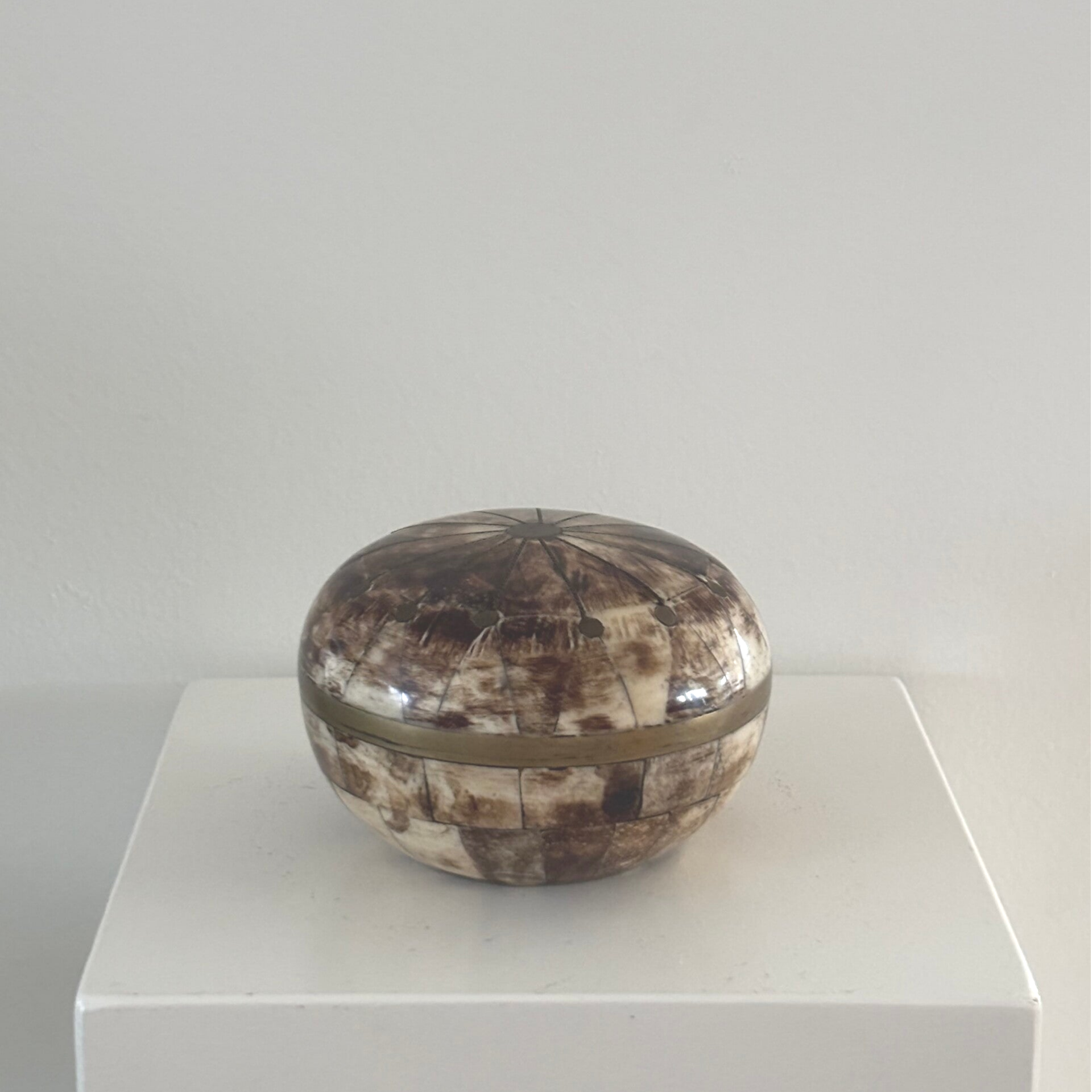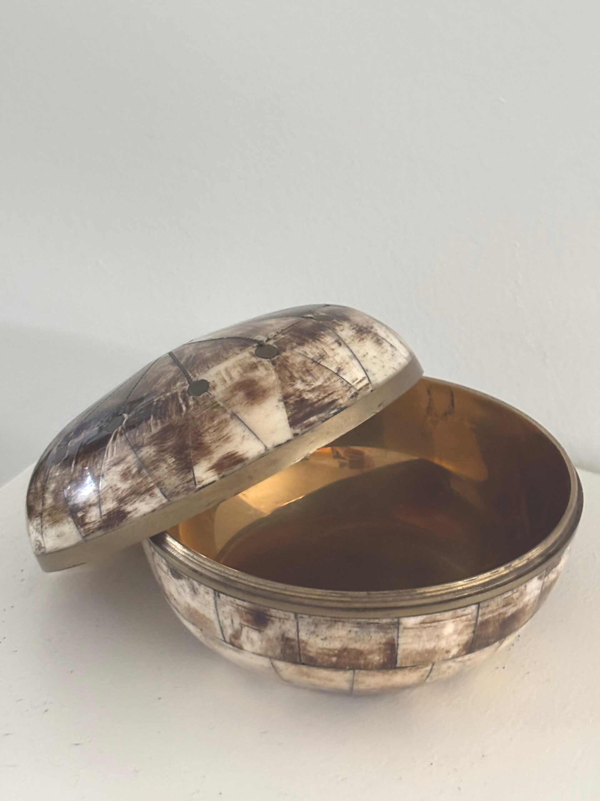An elegant brass box with inlaid imitation bone details. A refined decorative piece with a subtle, classic appeal. 5 x 11 cm.
