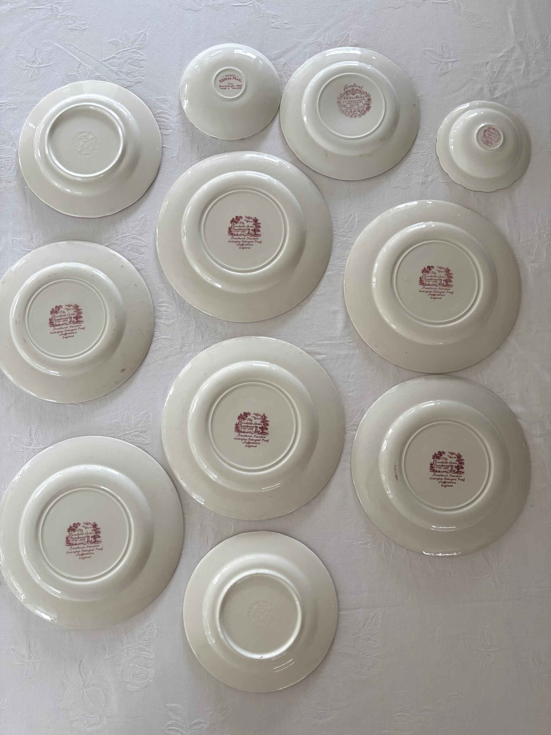 Atmospheric set of 11 English red plates, a characterful mix & match collection with rich heritage. The set includes 5 dinner plates (Ø 24 cm) and 1 breakfast plate (Ø 22.5 cm) from the Constable Bicentennial series (1776–1976) by Broadhurst Ironstone Staffordshire. Completed with 2 plates (Ø 20 cm), 1 Homeland plate by Grindley (Ø 19.5 cm) and 2 saucers by Myott Royal Mail (Ø 14.5 cm) and Ridgeway (Ø 13 cm). A warm, decorative set with an authentic English character.