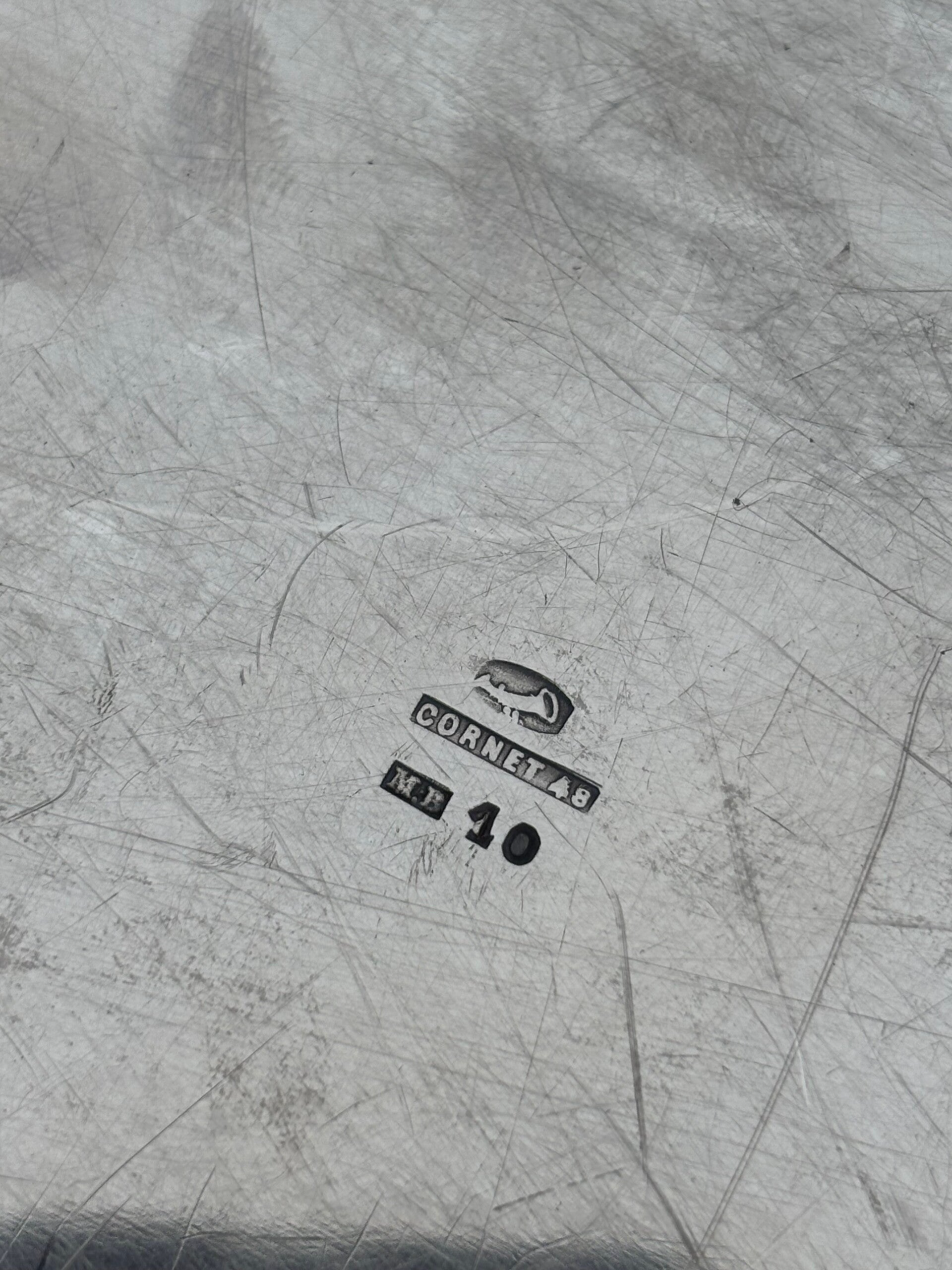 Een verfijnd verzilverd dienblaadje met opstaande geschulpte rand en elegante uitstraling. Mooi als serveerblad of decoratief accent. Afmetingen: 19 x 19 cm, hoogte 2,5 cm. Gemerkt aan de onderzijde: Cornet 48 M.B. 10. Prijs per stuk, meerdere exemplaren beschikbaar.