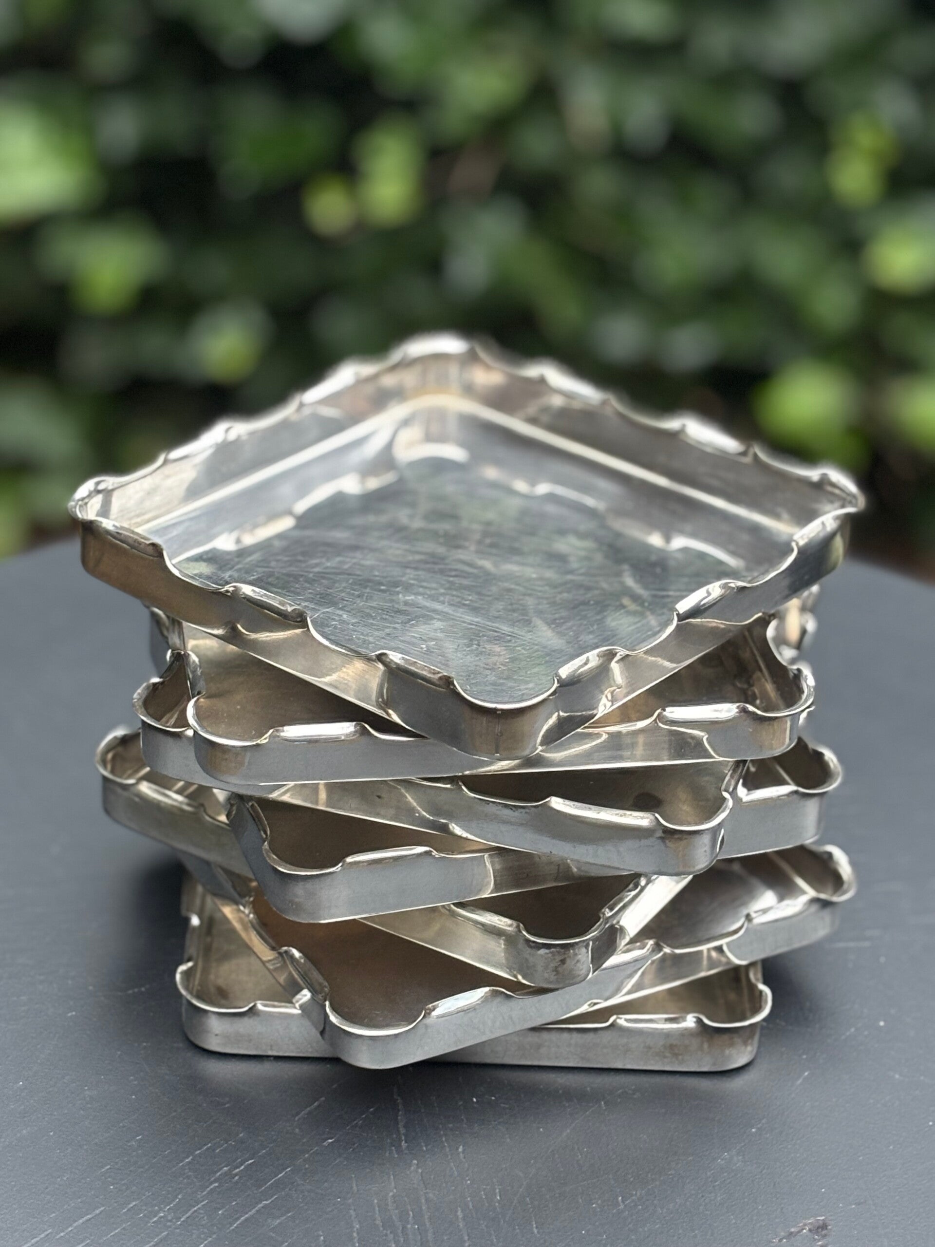 A refined silver-plated tray with a raised scalloped edge and elegant appeal. Perfect for serving or as a decorative accent. Dimensions: 19 x 19 cm, height 2.5 cm. Marked on the underside: Cornet 48 M.B. 10. Price per piece, several trays available.