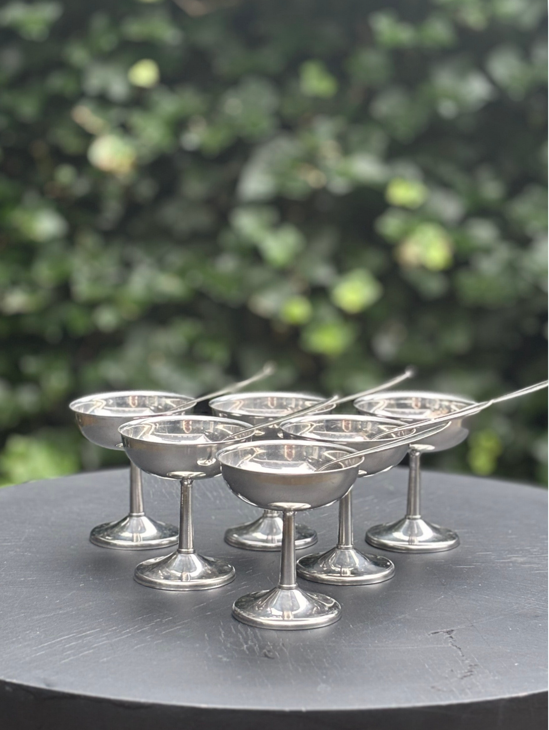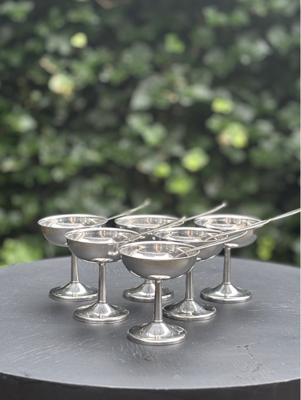 An elegant vintage set of 6 dessert coupes with matching spoons, crafted in stainless steel. Timeless in design and perfect for serving desserts or sweet treats on festive occasions.
