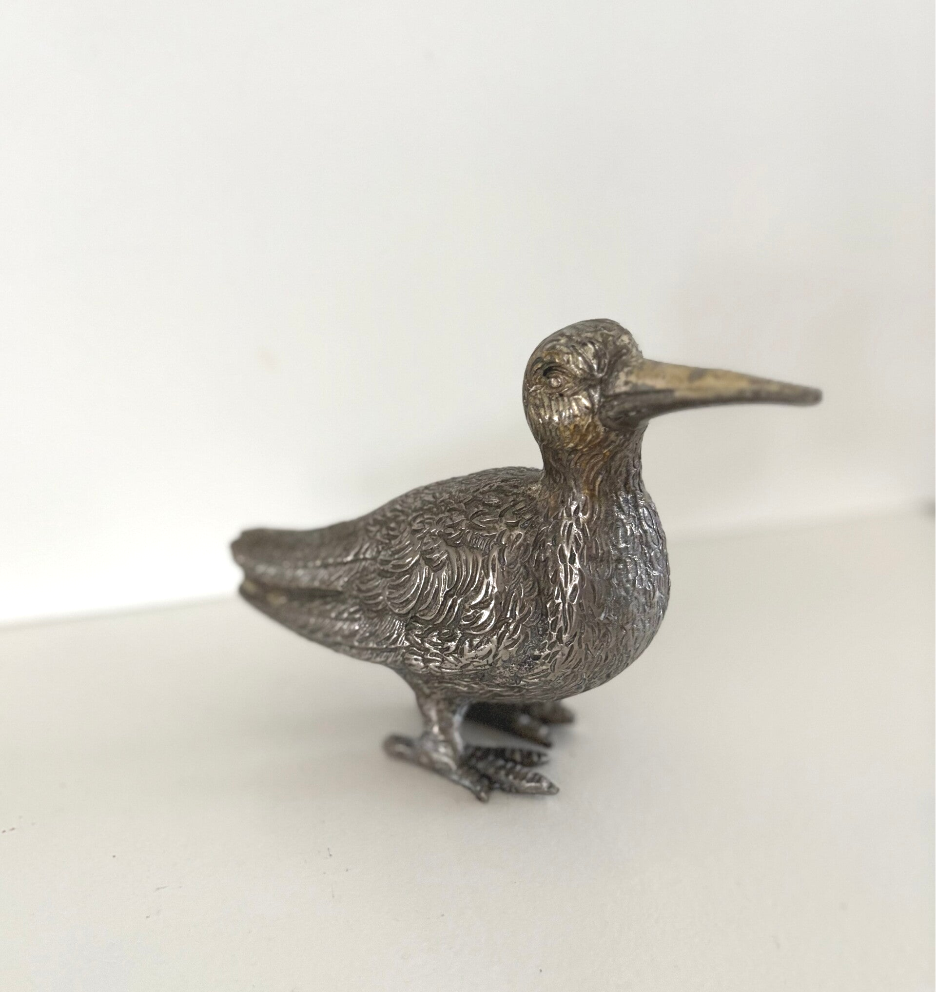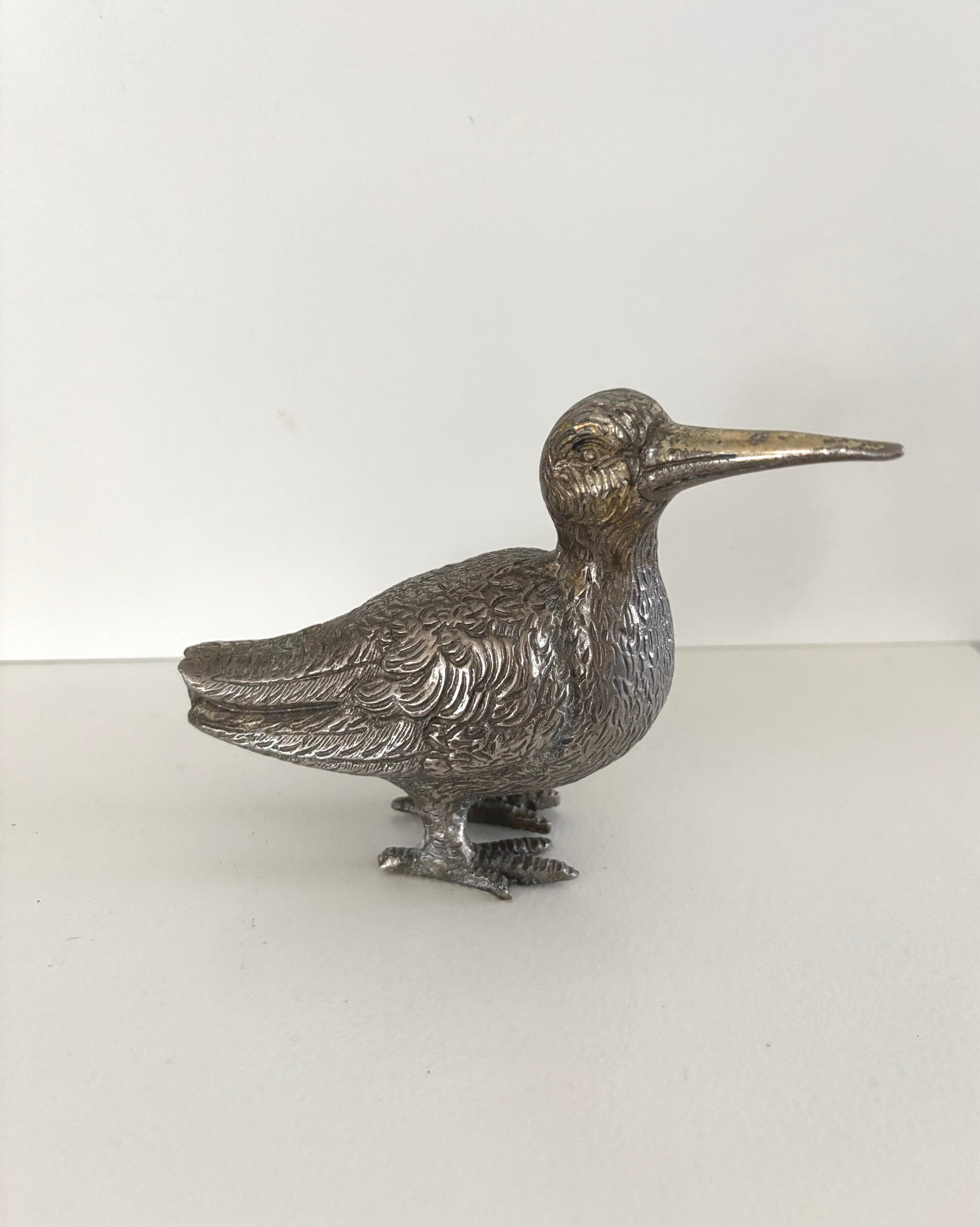 Een verfijnd verzilverd beeldje van een ijsvogel, rijk aan detail en elegantie. Een charmant decoratief object dat moeiteloos sfeer toevoegt aan tafel, kast of bureau. Afmetingen: 15 x 11 cm.