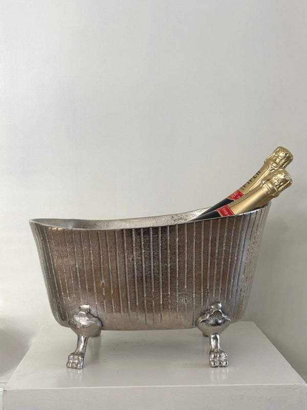 Metal Champagne cooler shaped like a bathtub. A playful yet elegant piece that adds instant charm to any table or gathering. Dimensions: 38.5 x 23.5 cm.