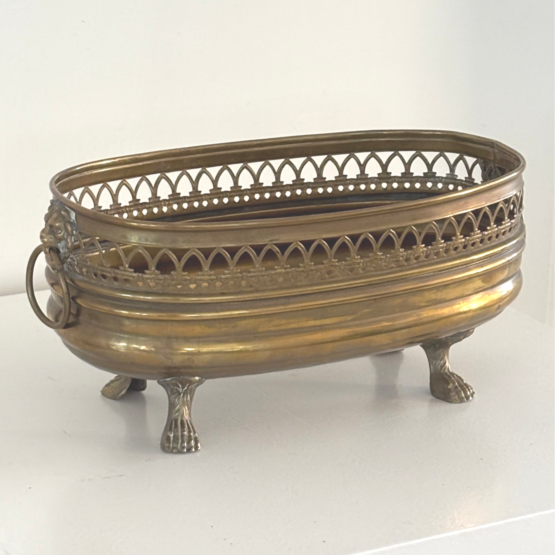 Elegant French copper jardinière adorned with sculpted lion heads. A classic decorative piece that brings character and refinement to any interior. Dimensions: 26 x 12 cm.