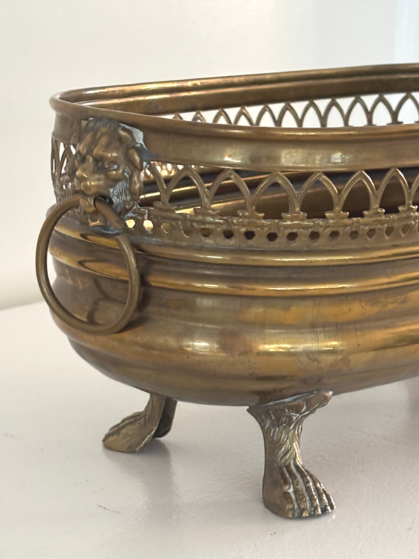 Elegante Franse koperen jardinière met sierlijke leeuwenkoppen. Een klassiek en decoratief object dat karakter en grandeur toevoegt aan ieder interieur. Afmetingen: 26 x 12 cm.