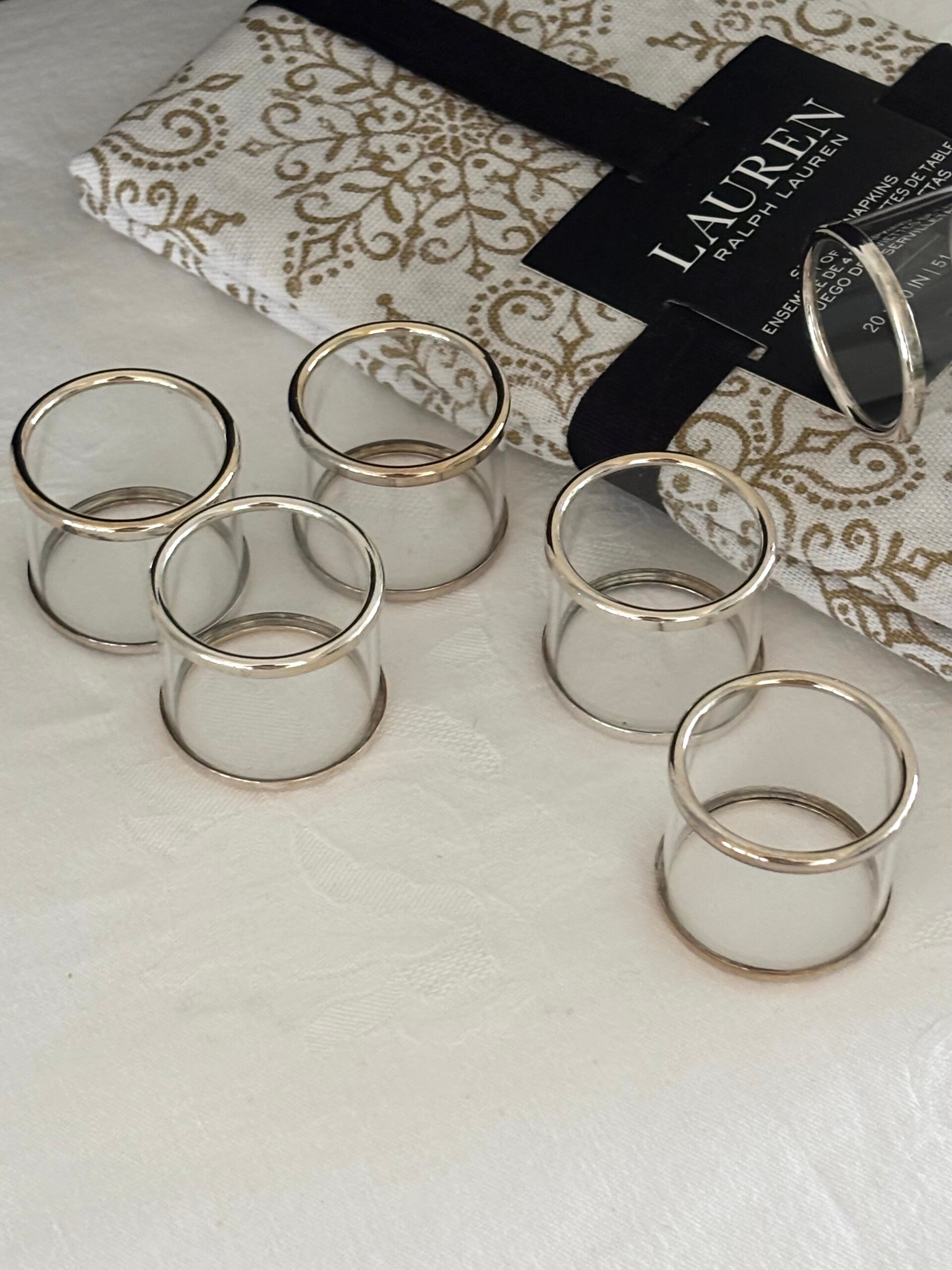A refined set of 6 glass napkin rings with a silver-plated rim. Elegant and understated, perfect for adding a touch of luxury to the table setting. Diameter: 3.2 x 3.7 cm.