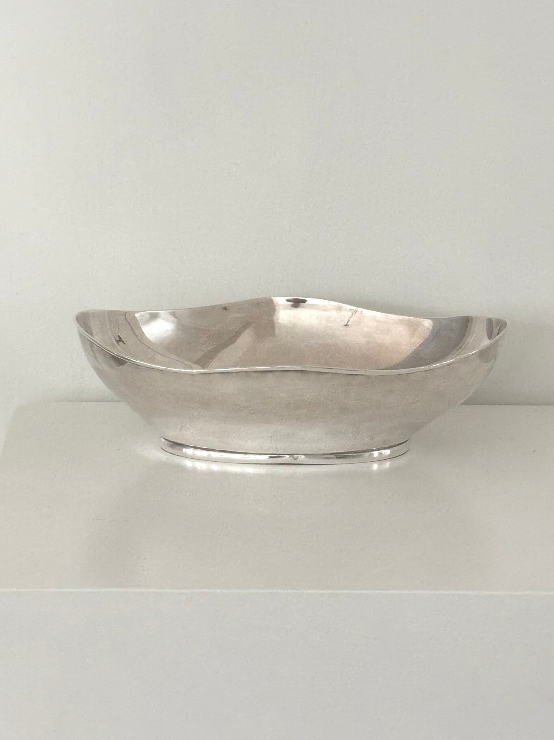 A refined silver-plated fruit bowl with elegant lines and silver hallmarks on the side. Crafted by Écuyer, France. A graceful piece for table or interior display. Size:27 x 19 cm.