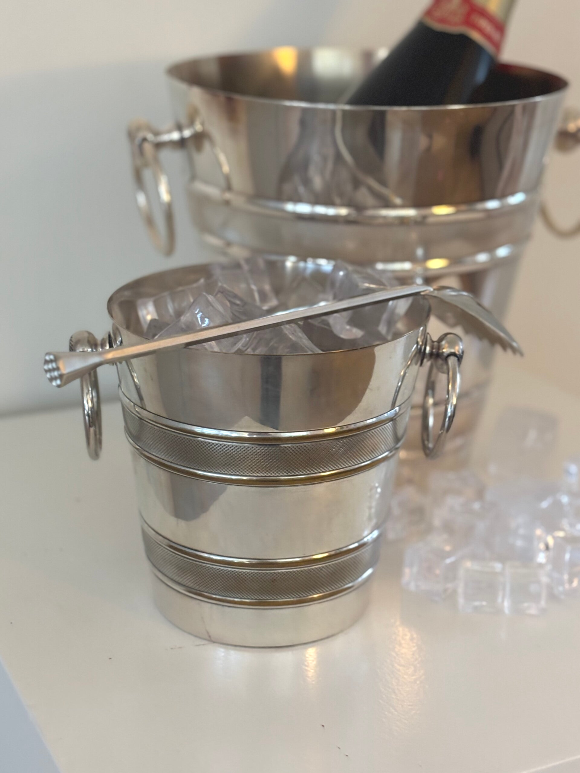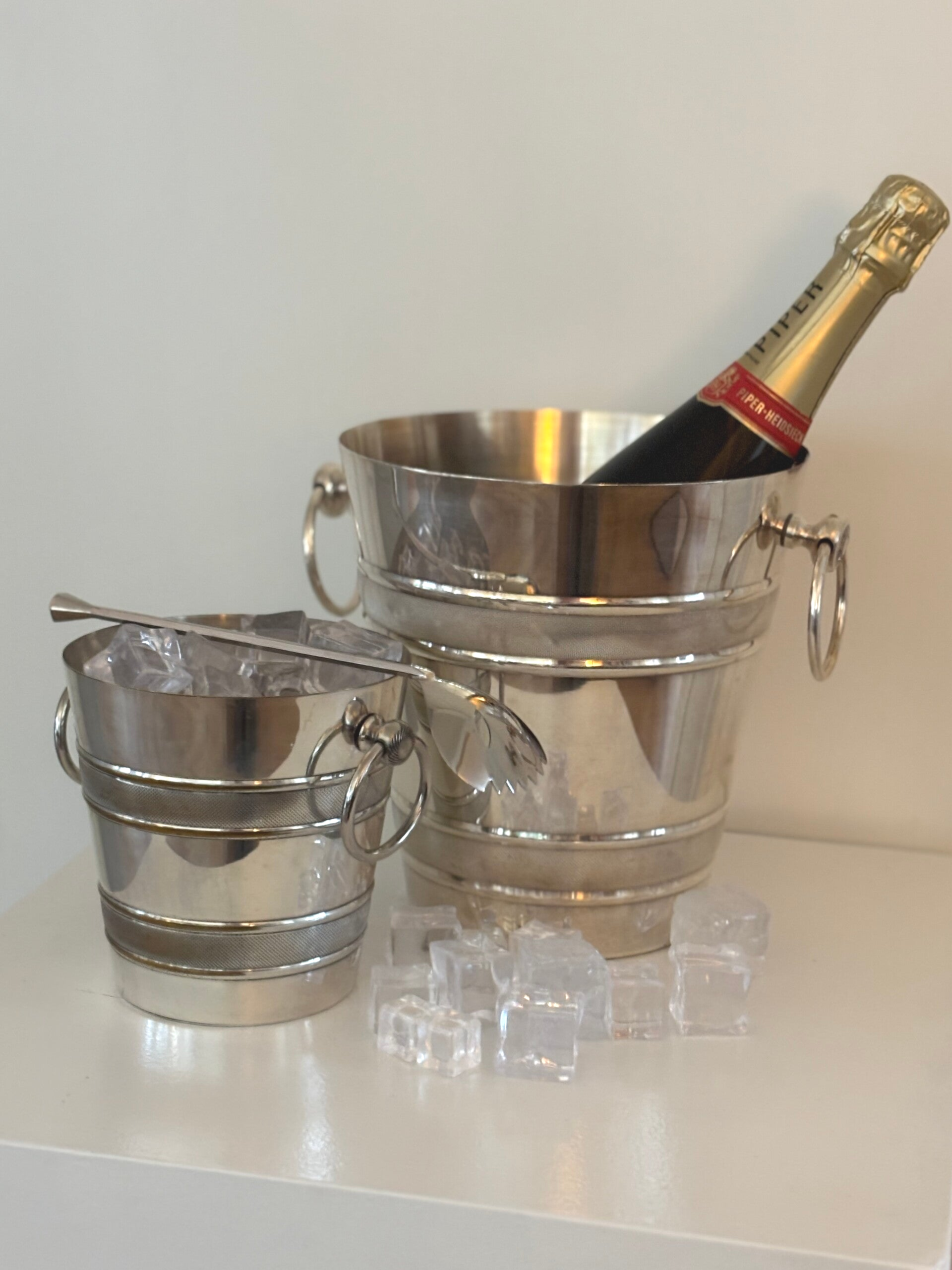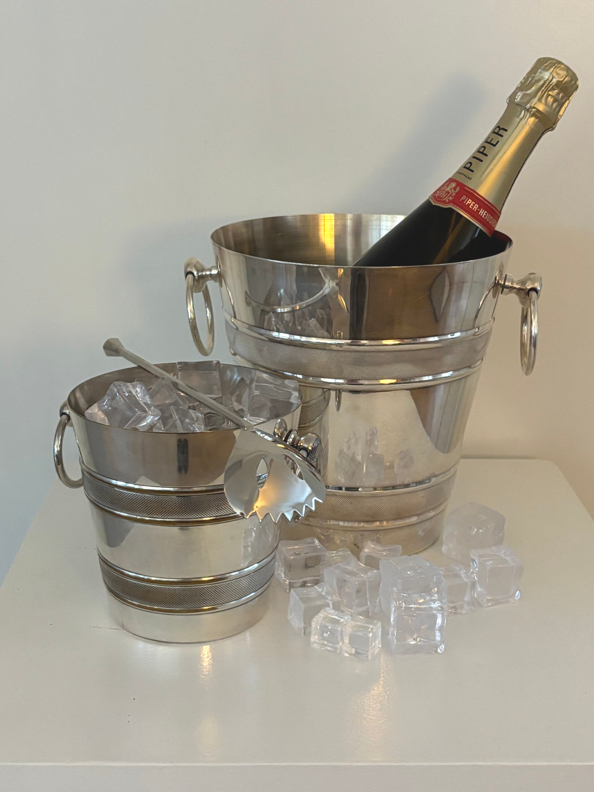 A beautiful set comprising a silver-plated Champagne cooler, a matching ice bucket and an elegant silver-plated ice spoon. A refined ensemble for festive occasions and stylish entertaining. Champagne cooler dimensions: 20.5 x 19.5 cm. Ice bucket: 13.5 x 13.5 cm. Ice scoop: 23 cm.