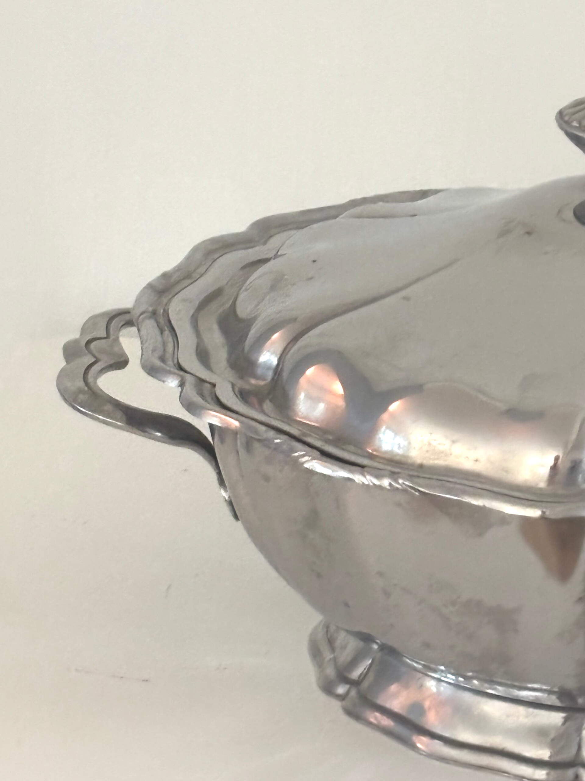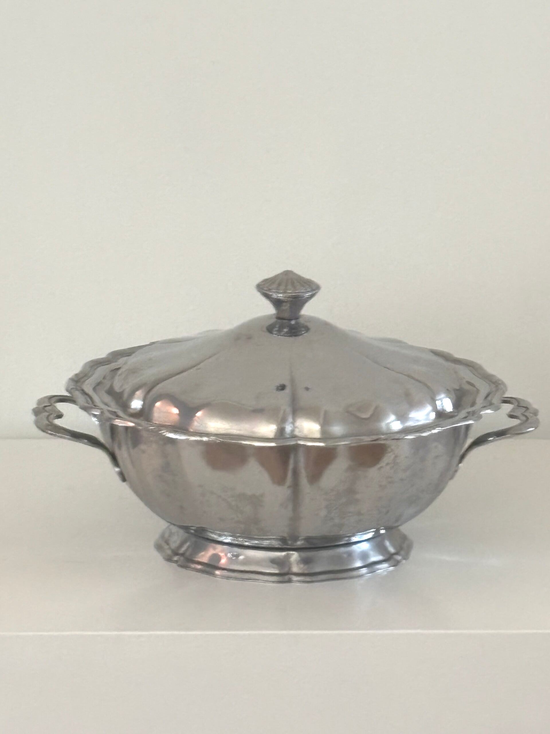 Stylish stainless steel covered dish with a delicately scalloped edge. Elegant and functional, a refined piece for serving and presentation. Dimensions: 26 x 17 cm.