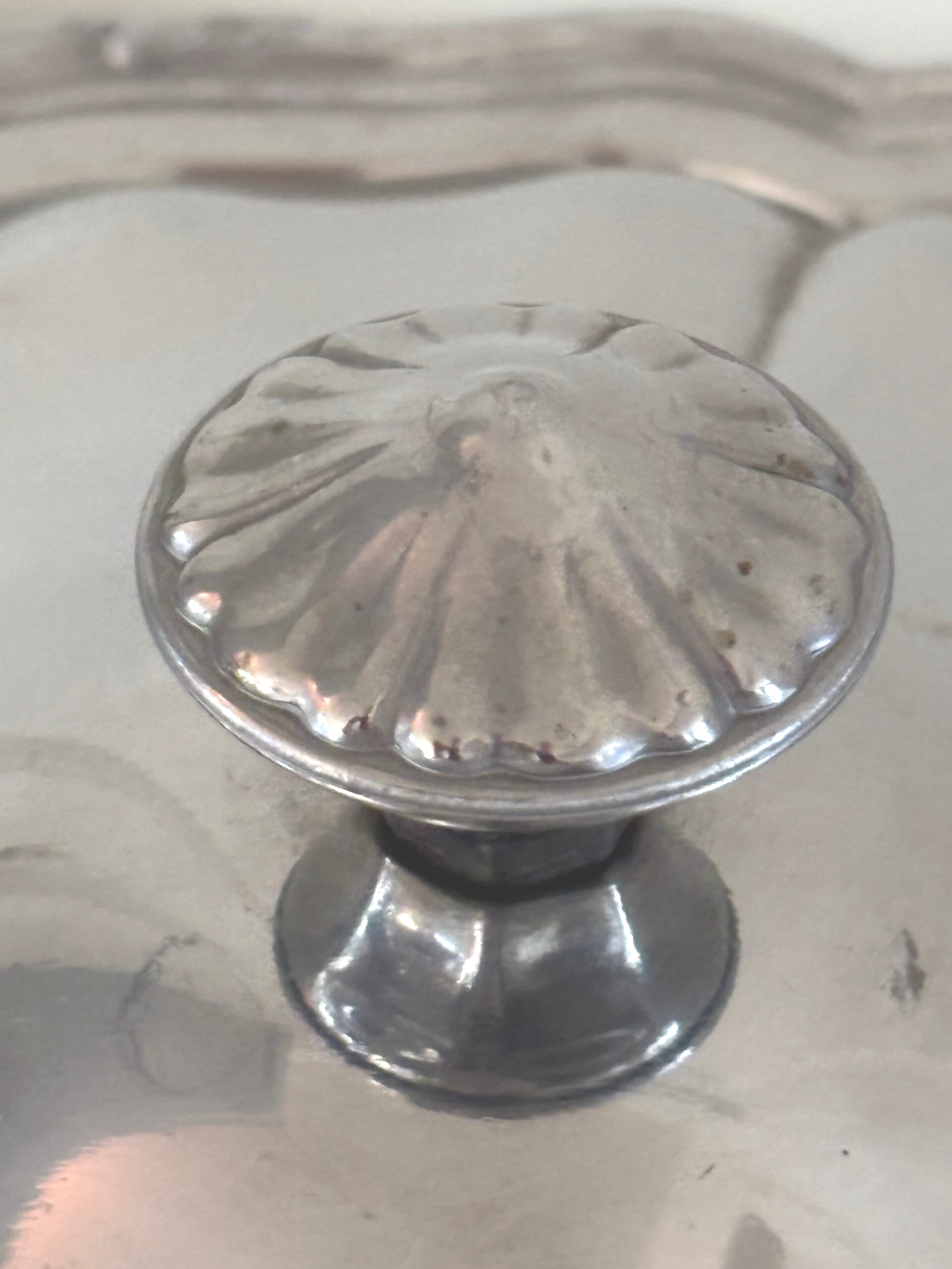 Stijlvolle dekselschaal van inox met een sierlijk geschulpte rand. Elegant en functioneel, een verfijnd item voor serveren en presenteren. Afmetingen: 26 x 17 cm.