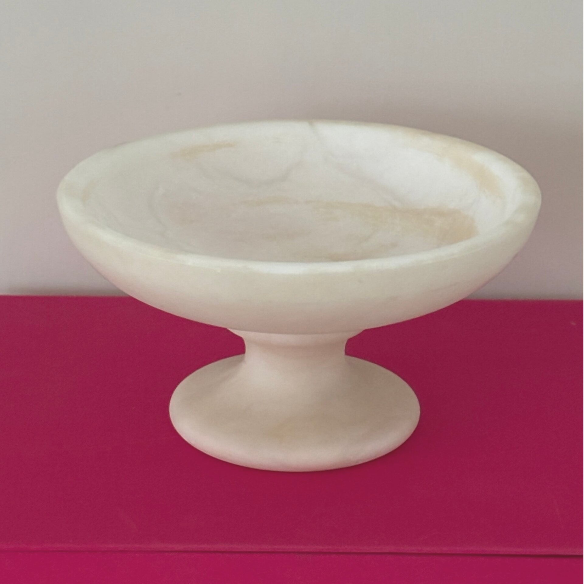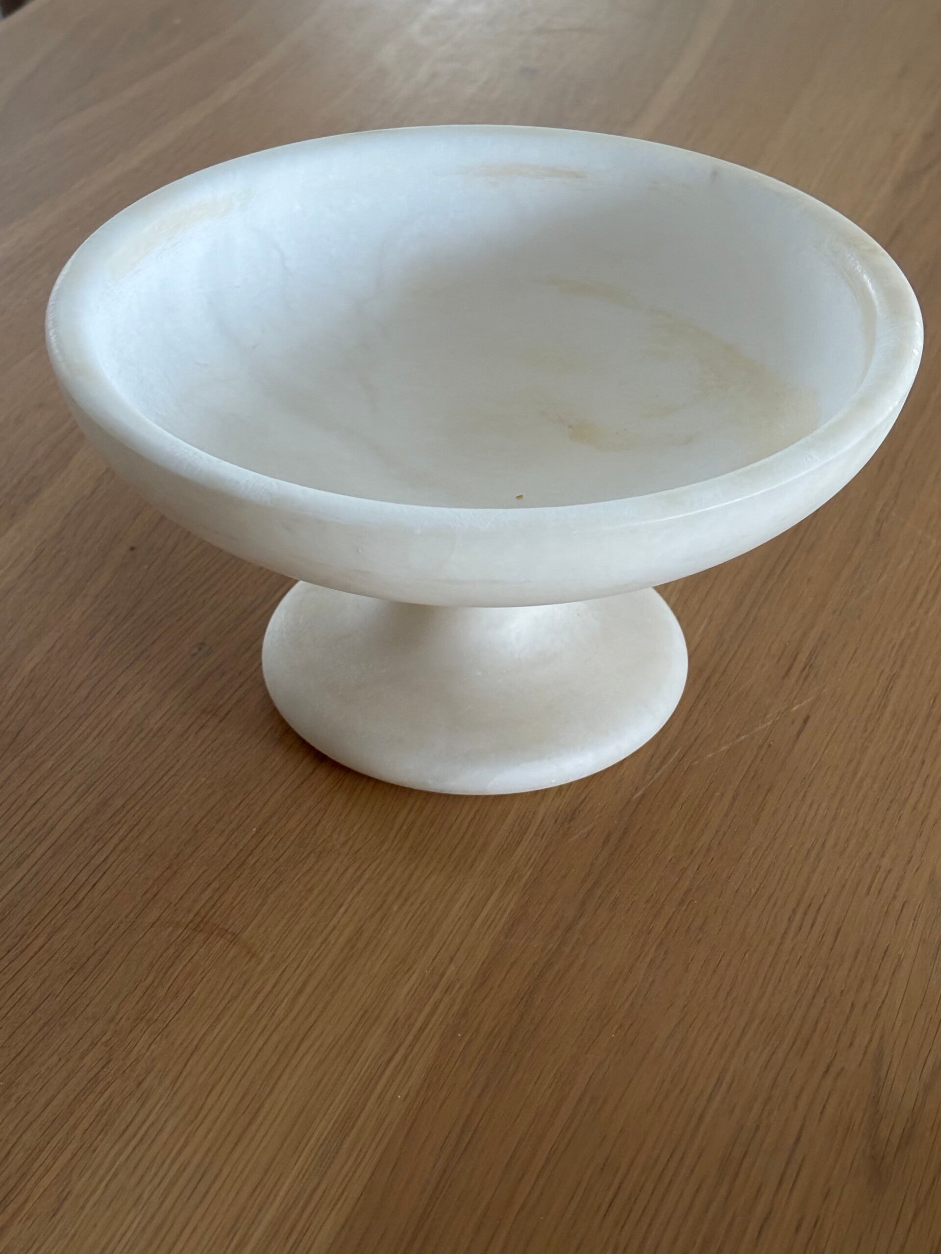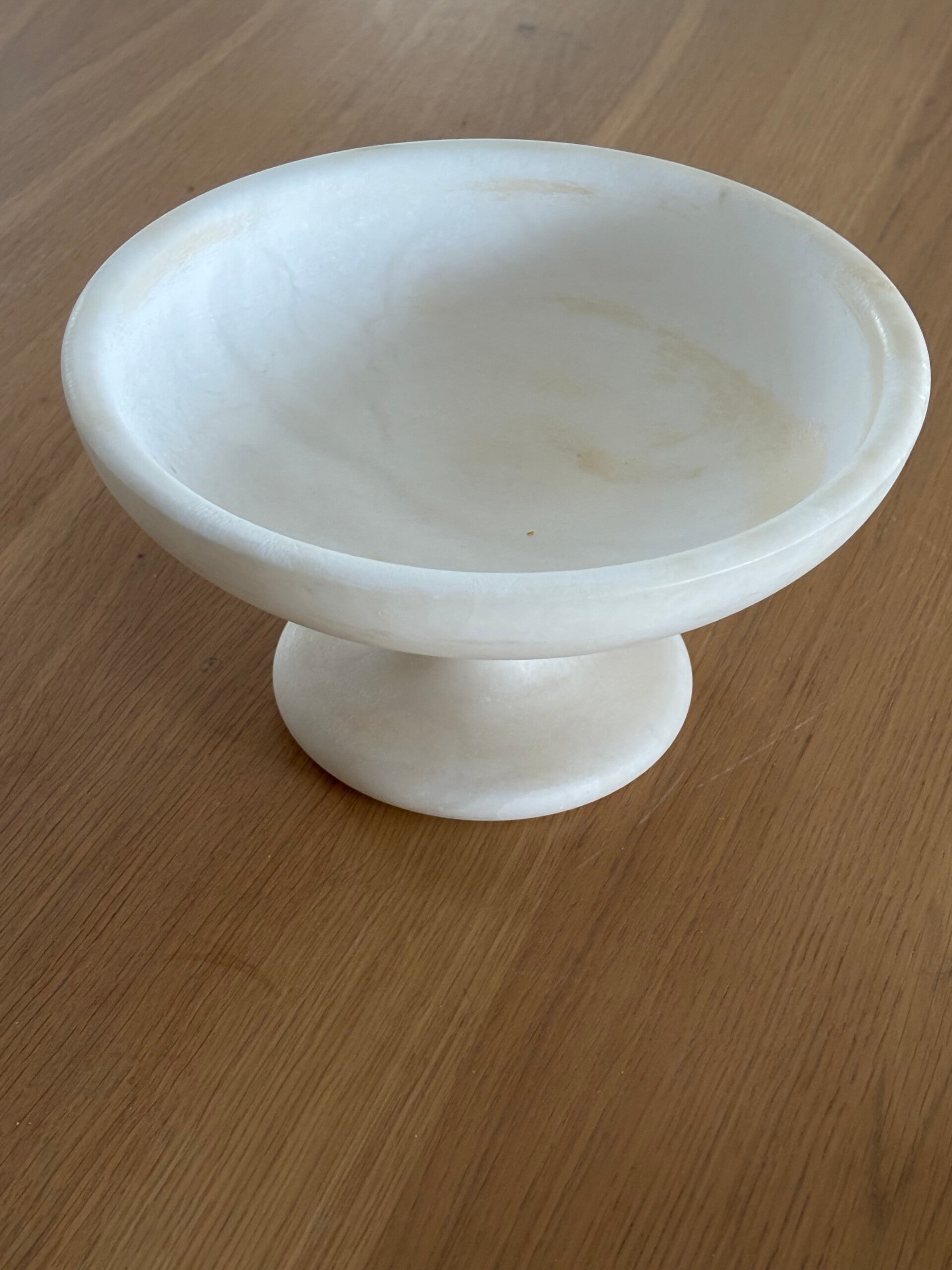 Elegant alabaster pedestal bowl with a timeless and refined appearance. A decorative piece that adds serenity and sophistication to any interior. Dimensions: 11 x 20 cm.