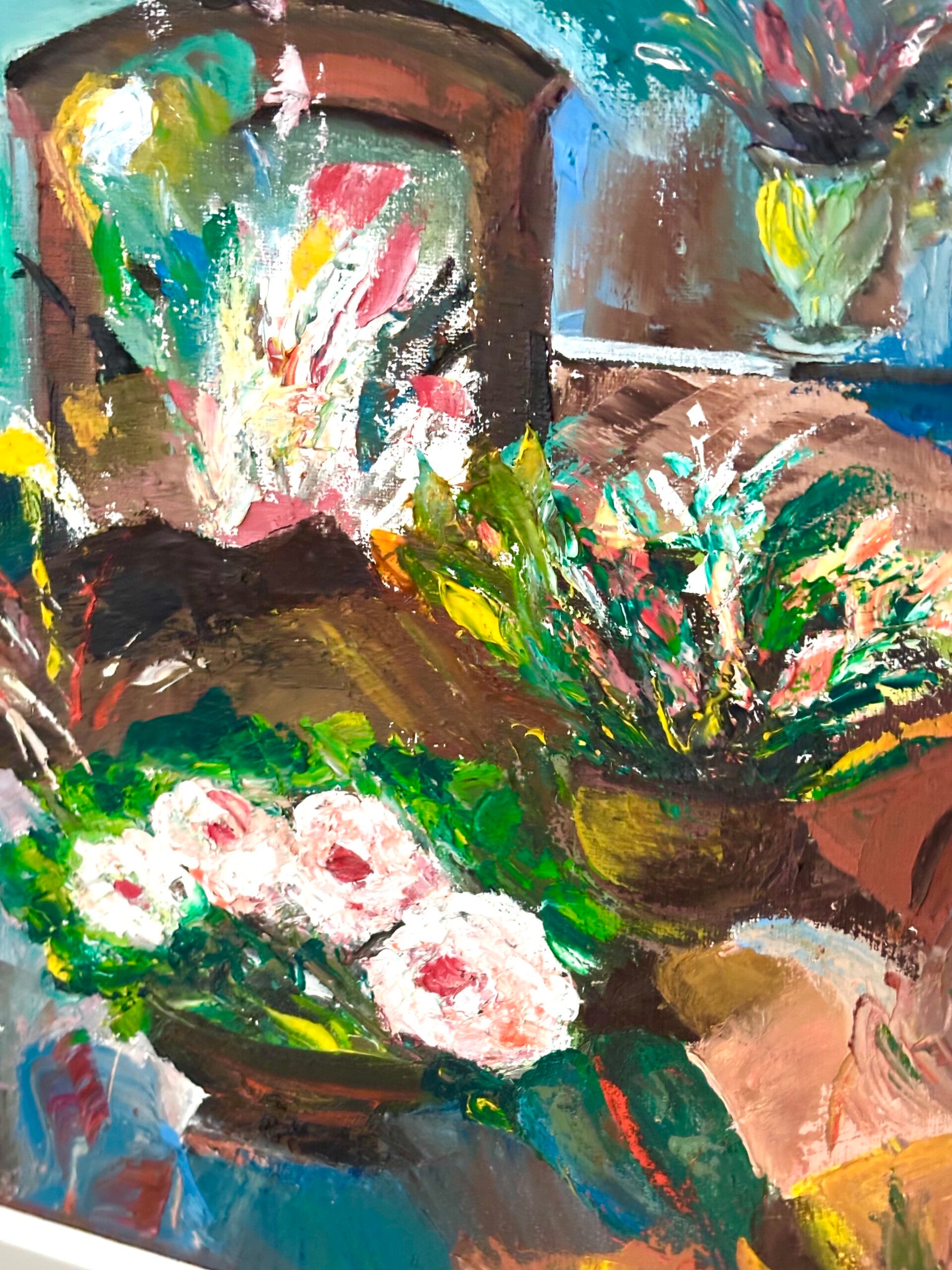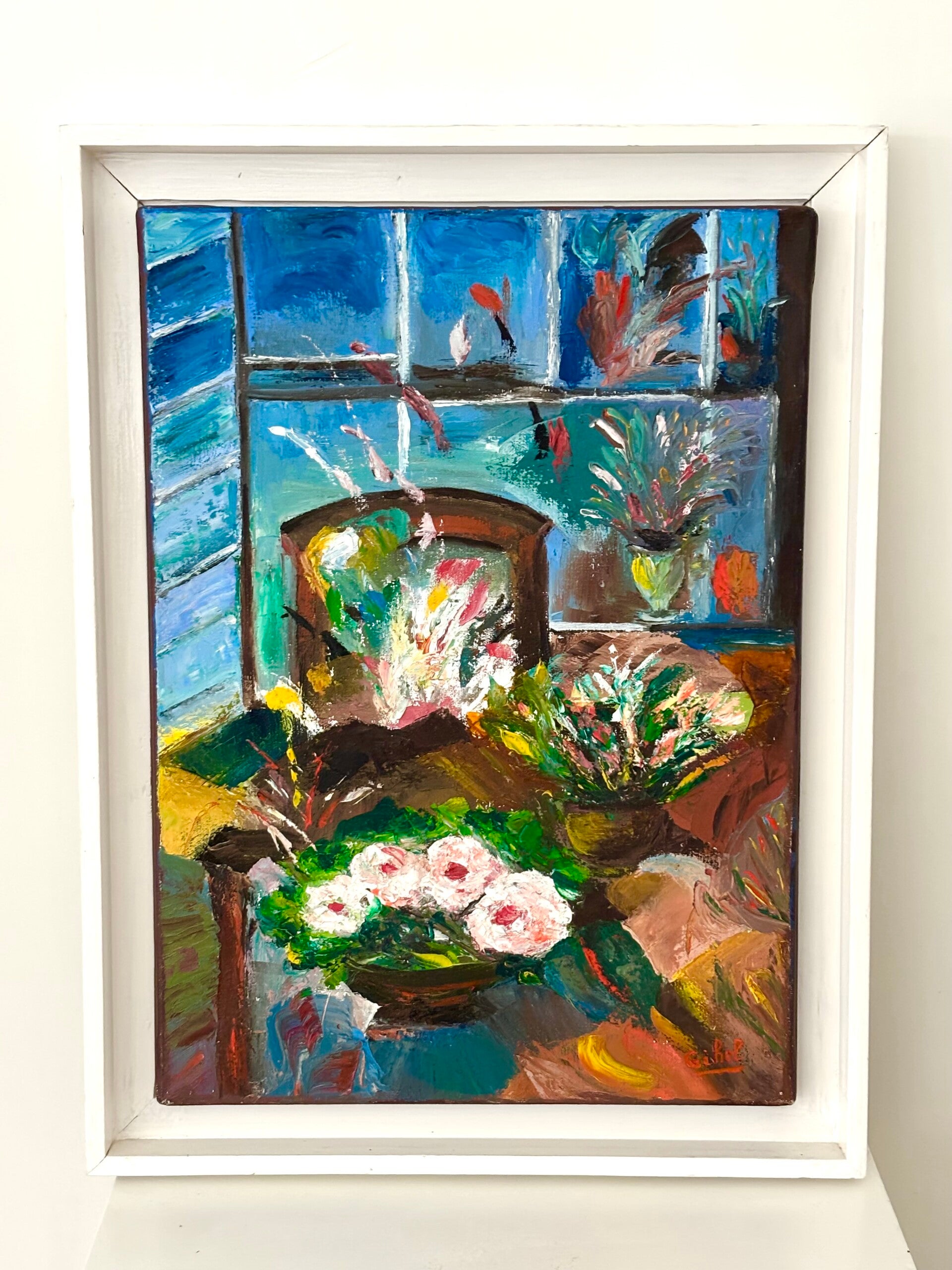 Painting on canvas featuring an atmospheric composition of vases with flowers on a table, set in a white wooden tray frame. Signed ‘Gihel’. The reverse bears a personal dedication, adding unique character to the piece. A refined eye-catcher for any interior. Dimensions: including frame 40.5 x 53 cm, canvas 46 x 33.5 cm.