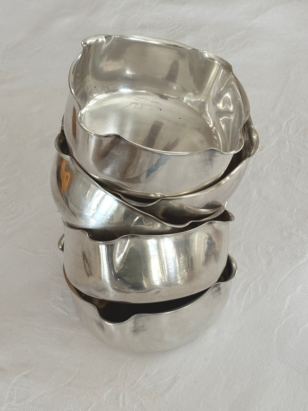 Set van 5 verzilverde schaaltjes van Ercuis. Elegant en tijdloos, perfect voor het serveren van kleine lekkernijen of als decoratief accent. In mooie vintage staat. Afmetingen: 12,5 x 5 cm.