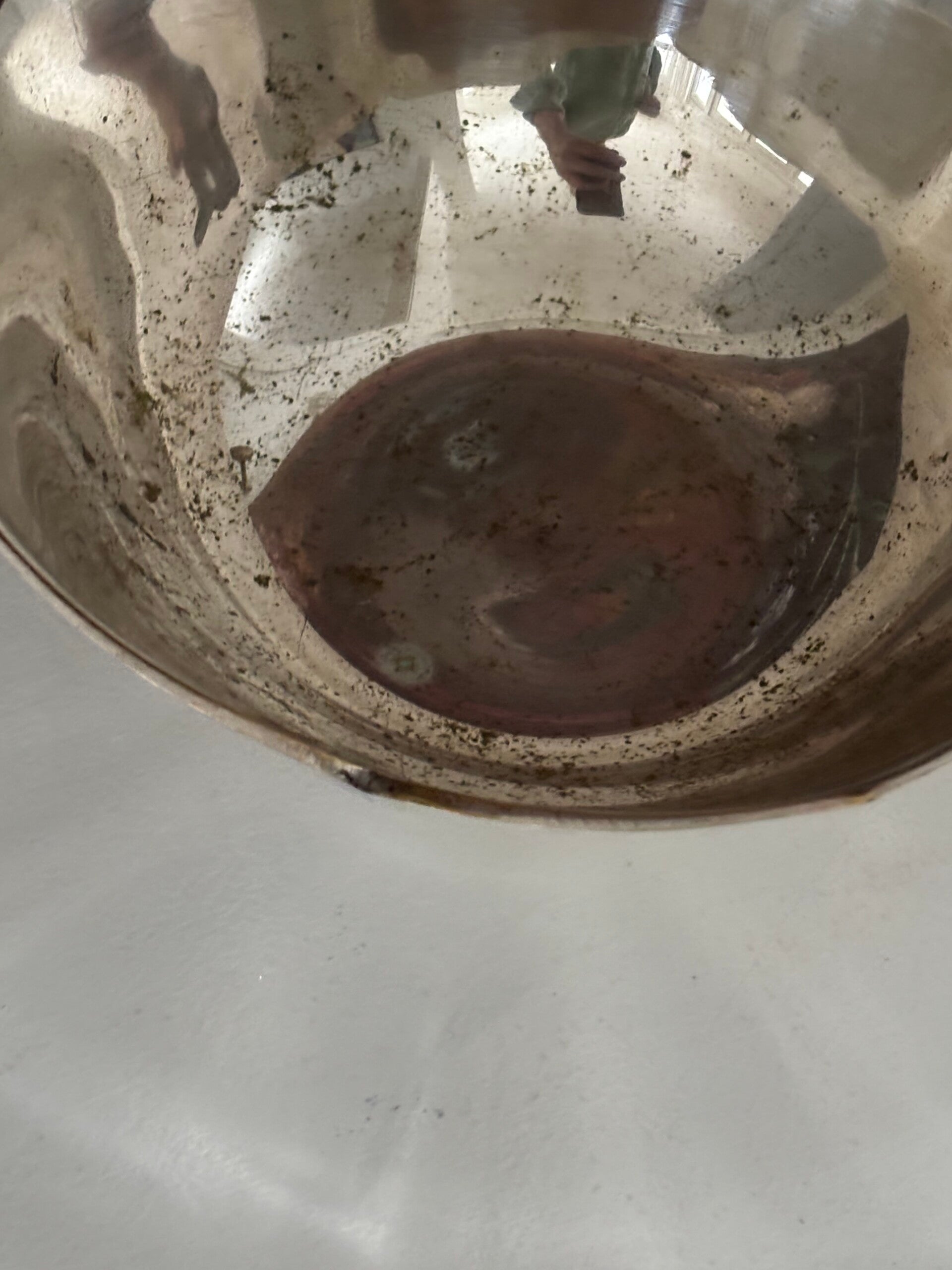 Verzilverde lotusschaal met een elegante, organische vorm. Een zwaar en karaktervol object met mooie signs of age en bijpassende patina aan de binnenzijde. Afmetingen: 18,5 x 8,5 cm.