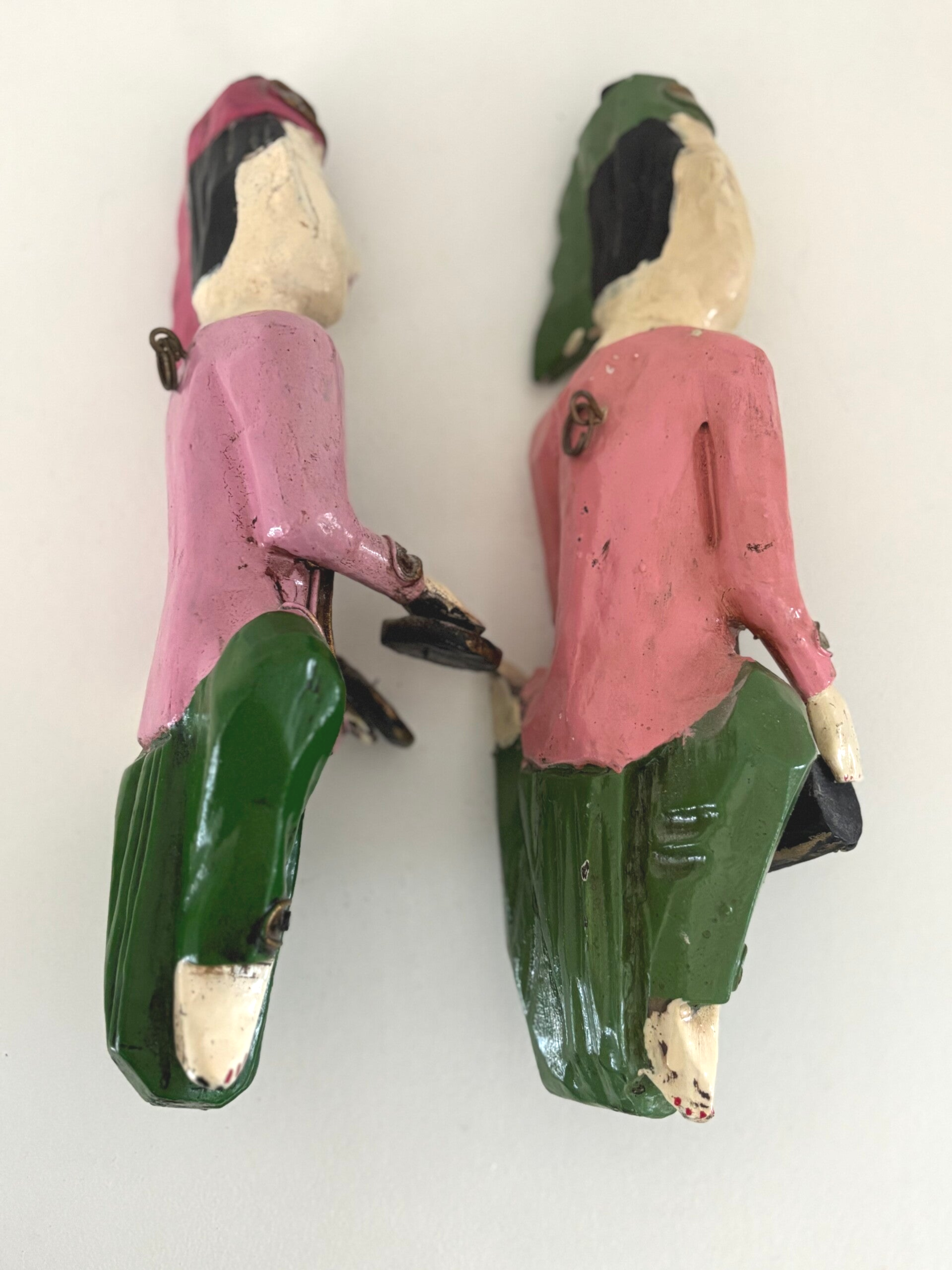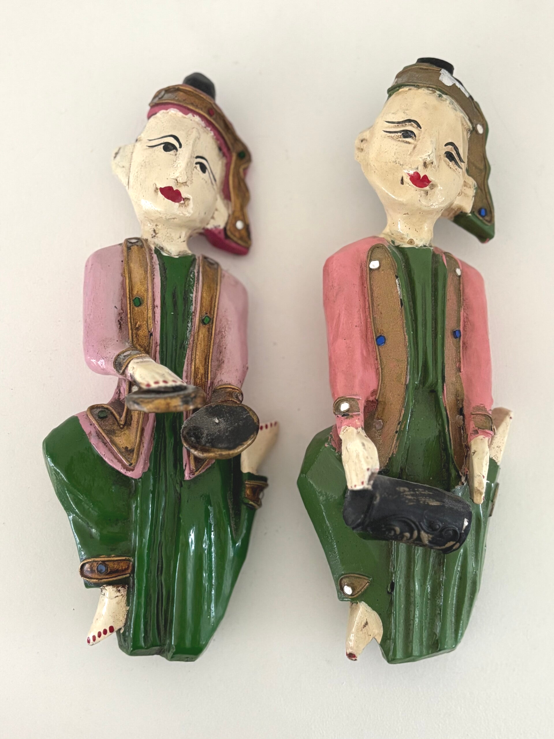 Pair of hand-painted wooden Thai wall figures with refined detailing and an authentic character. A decorative and atmospheric duo. Dimensions: 27 x 12 cm.