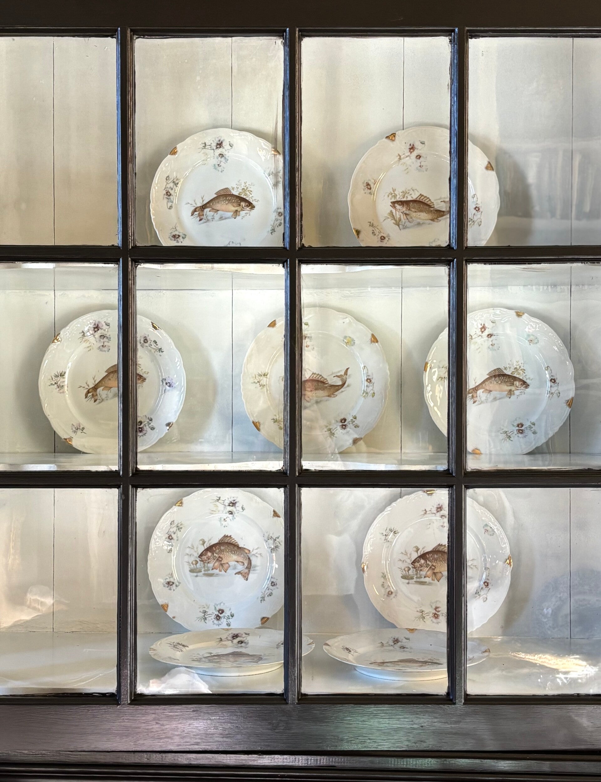 Set van 9 antieke porseleinen borden, verfijnd gedecoreerd met een vis, florale details en vergulde accenten. Een elegant en karaktervol geheel, in hele mooie staat. Diameter: 23,5 cm.
