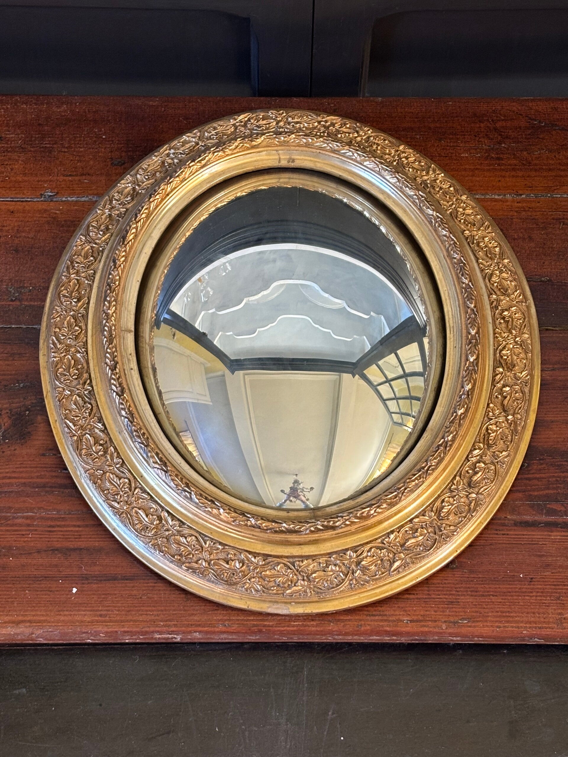 Antieke ovale fisheye-spiegel met bol spiegelglas, een bijzonder en sfeervol object met karakter. De unieke vorm en vervormende reflectie maken dit tot een zeer decoratief stuk aan de wand. Afmetingen: 44 x 37 cm.