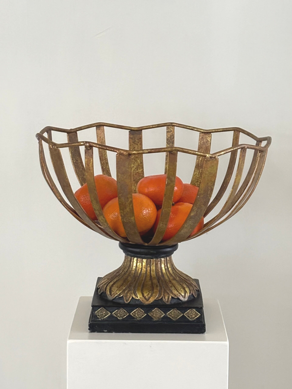 Grote schaal op voet in empire stijl met een verfijnde open structuur. Een elegant decoratiestuk dat tevens prachtig dienstdoet als fruitschaal. Afmetingen: 24 x 30 cm.