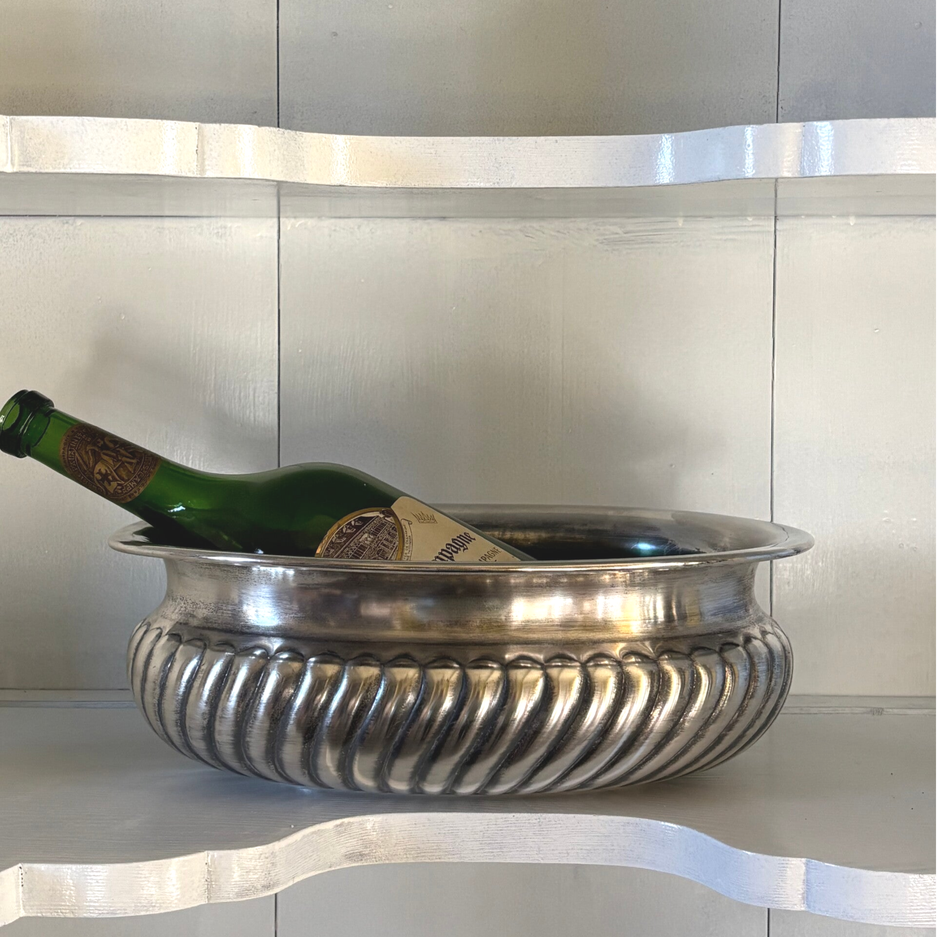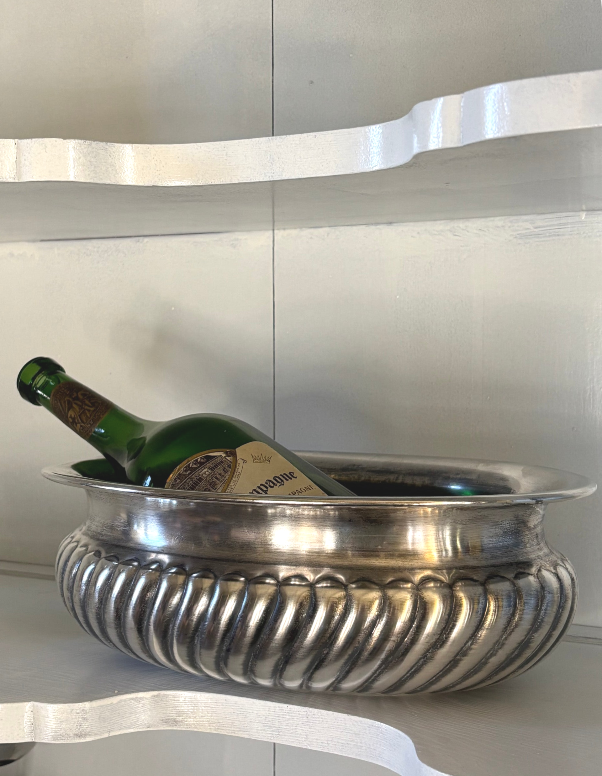 Verzilverde Champagne-/wijnkoeler met elegante uitstraling, geschikt voor 1 à 2 flessen. Voorzien van een sticker onderop ‘Kortrijks zilverhuis’. Een stijlvol item voor feestelijke gelegenheden. Afmetingen: 32 x 23 cm.