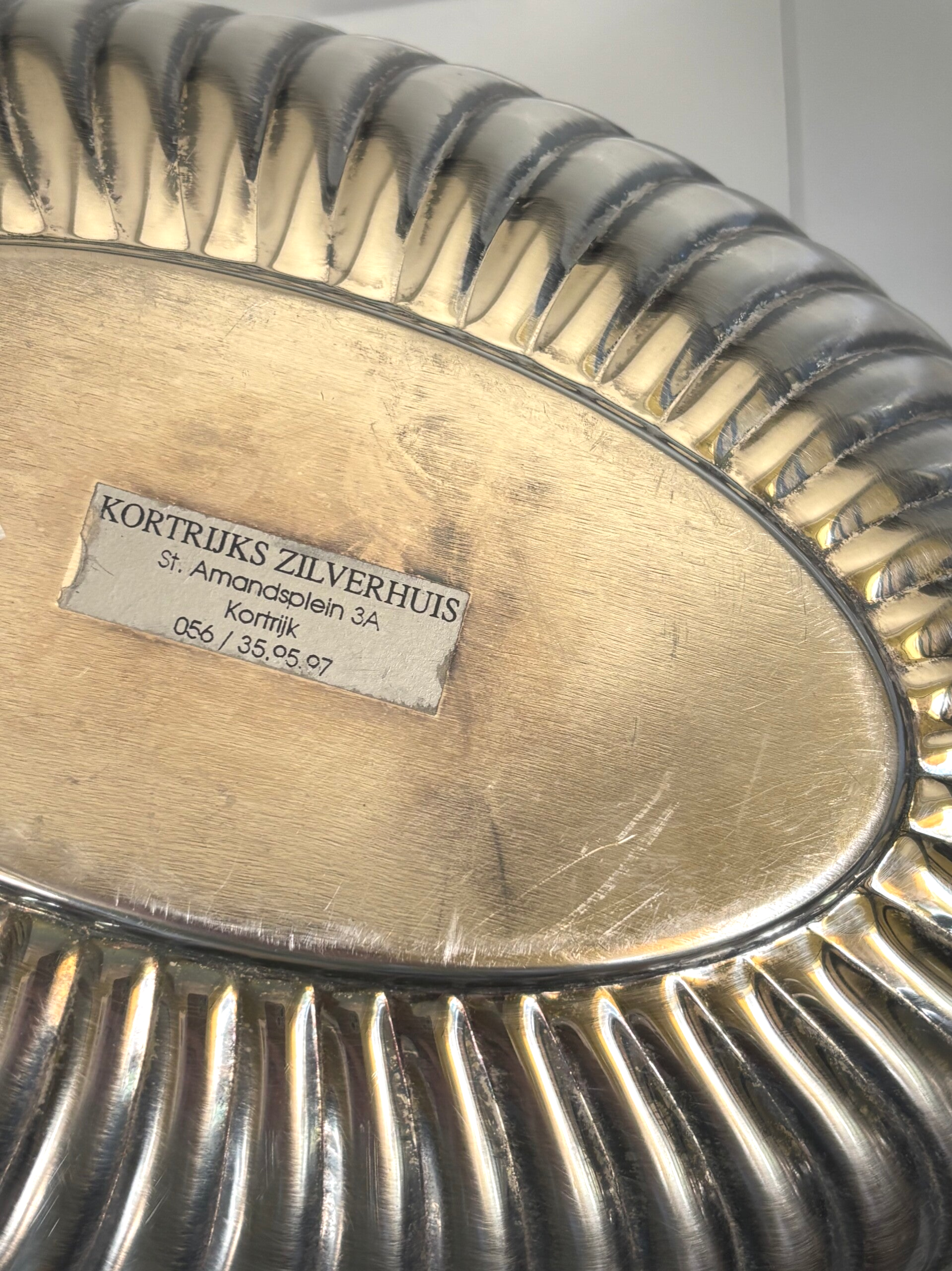 Silver-plated Champagne/wine cooler with an elegant appearance, suitable for 1 to 2 bottles. Marked underneath with a ‘Kortrijks zilverhuis’ sticker. A stylish piece for festive occasions. Dimensions: 32 x 23 cm.