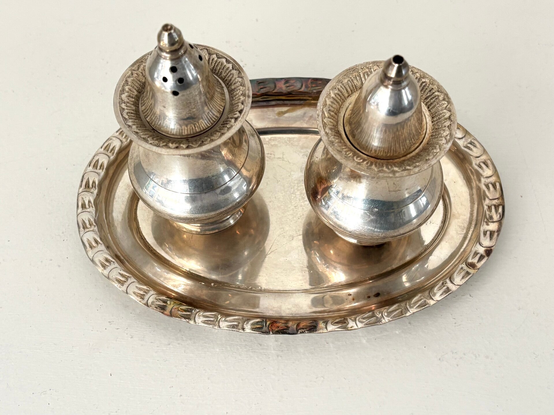 Verzilverd peper- en zoutstelletje gepresenteerd op een bijpassend schaaltje. Een elegant en verfijnd tafeldetail met klassieke uitstraling. Tijdloos en stijlvol in elke setting.