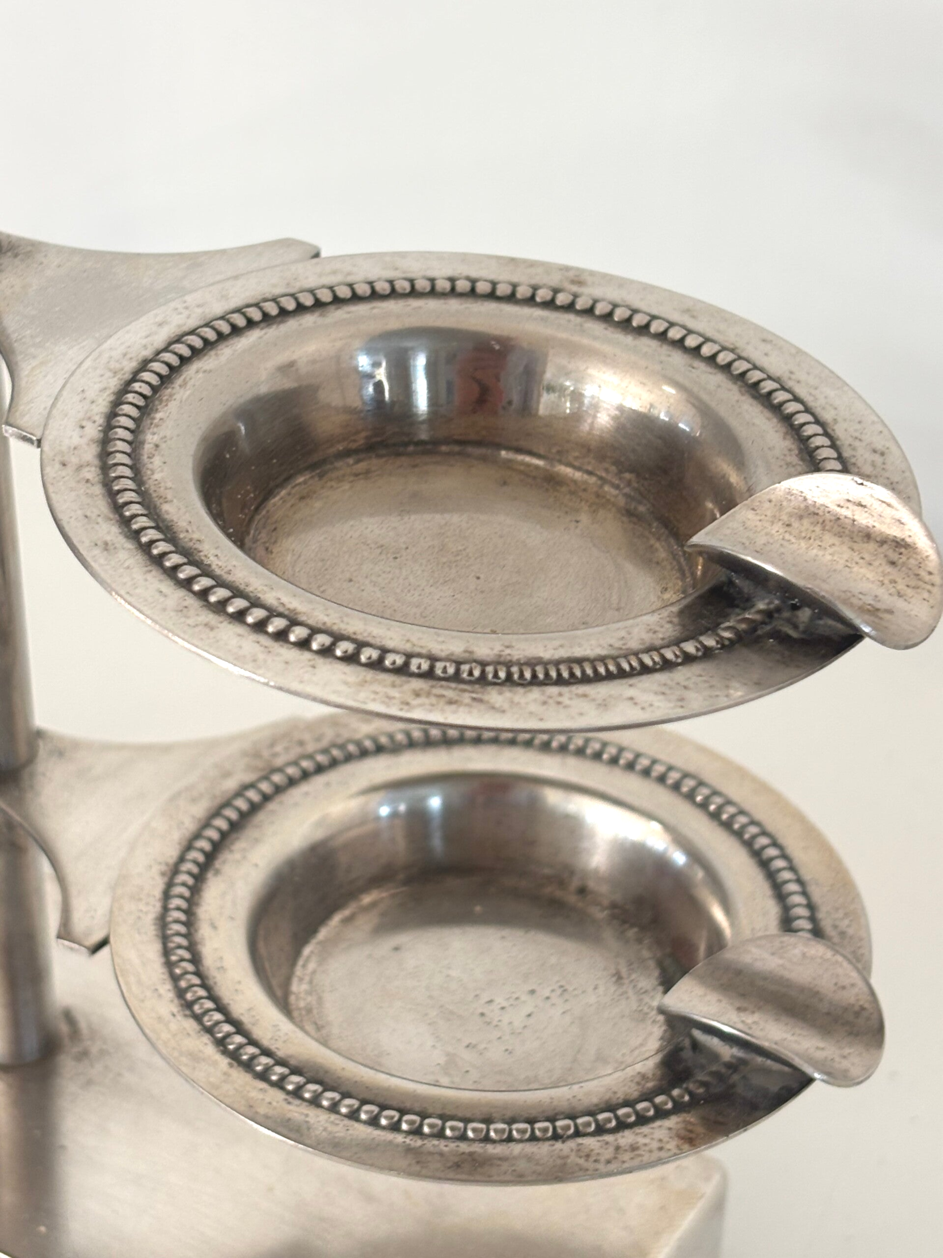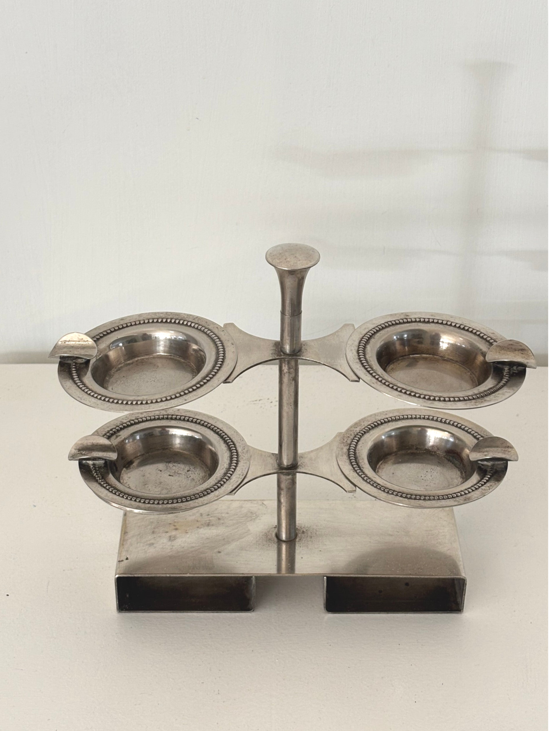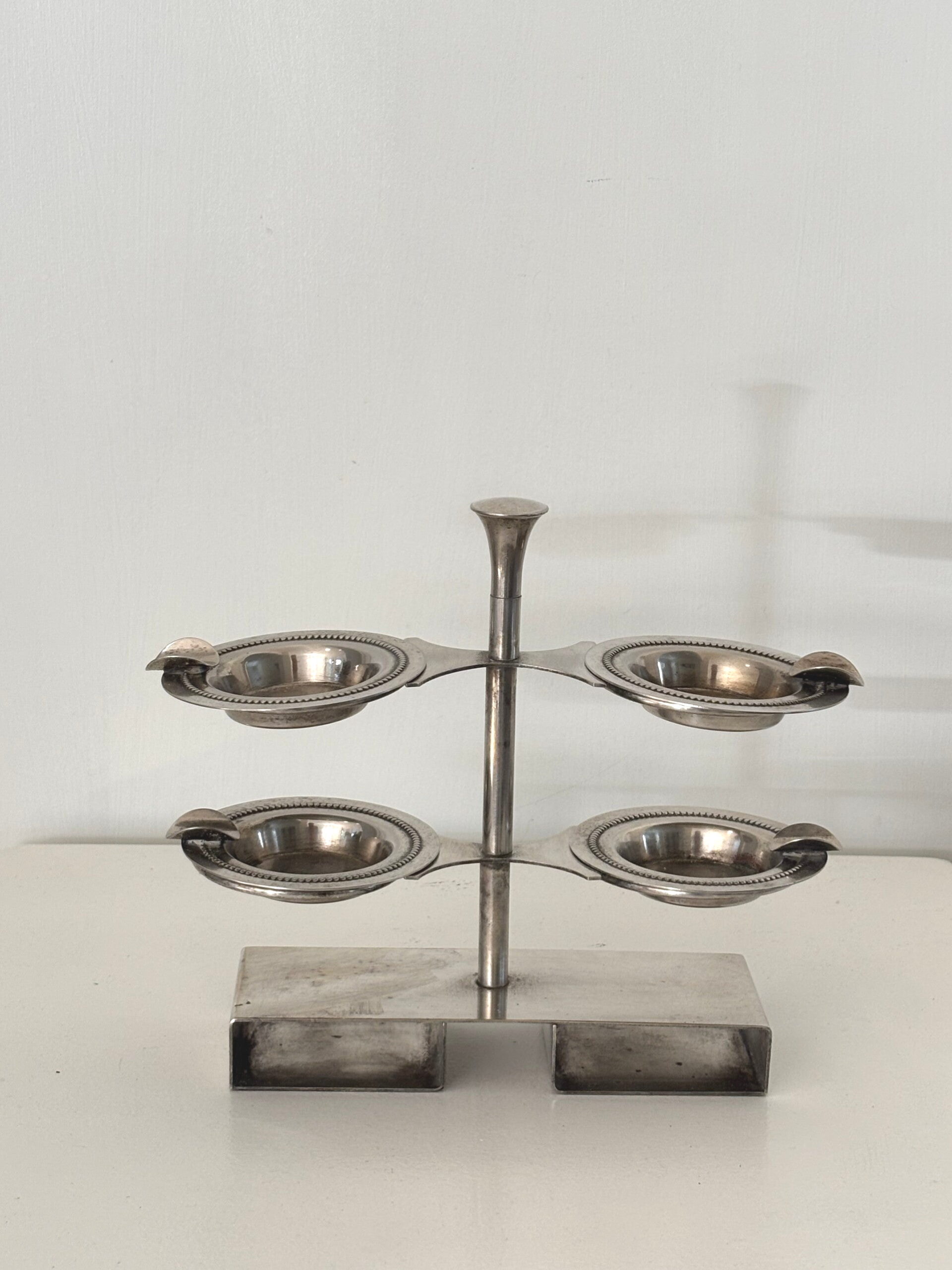 Vintage design asbakstandaard uit het midden van de 20e eeuw, voorzien van 4 uitneembare asbakjes. Een stijlvol en functioneel object met een tijdloze uitstraling, prachtig in een retro of modern interieur. Afmetingen: 21,5 x 19,5 cm.