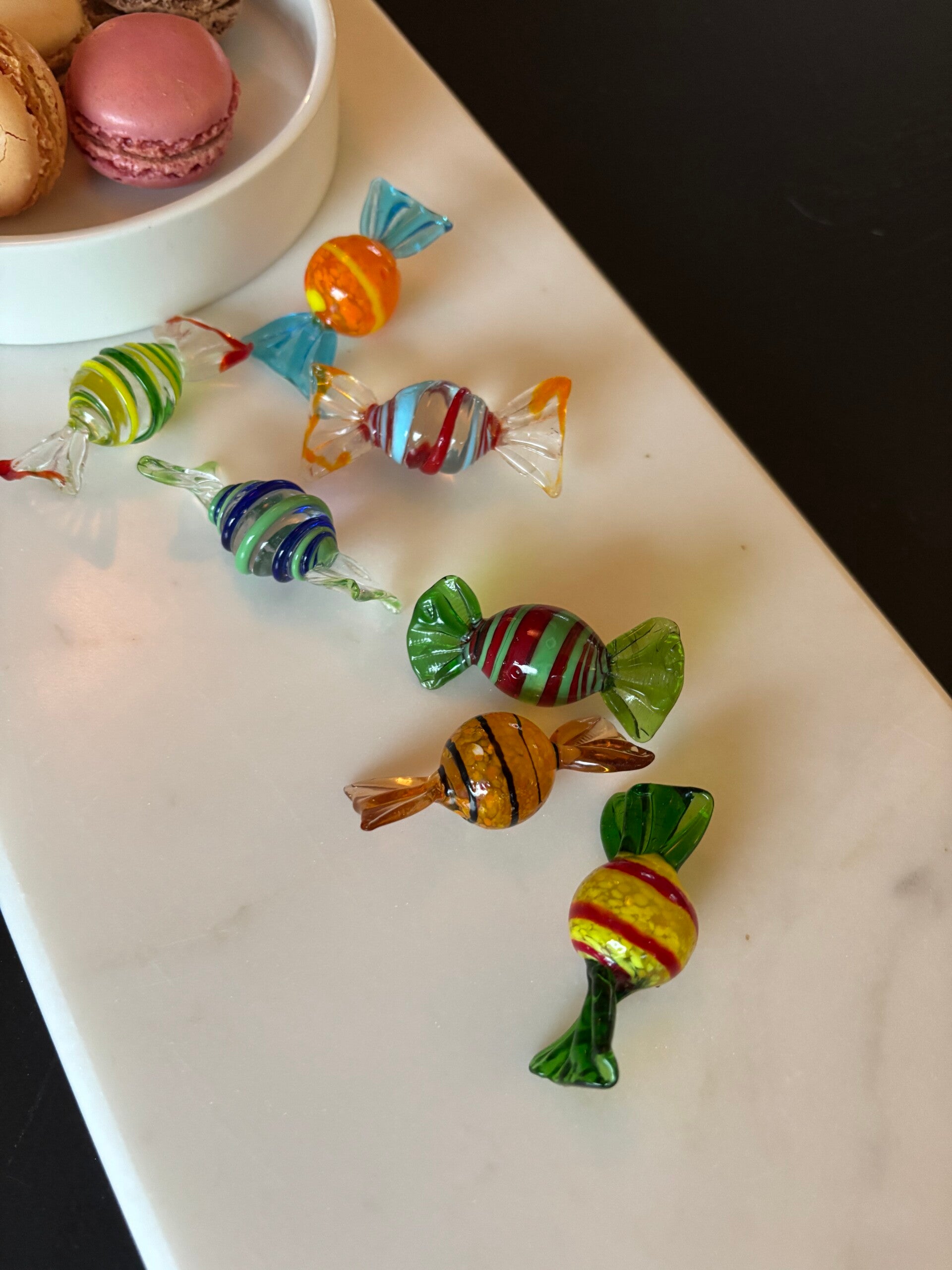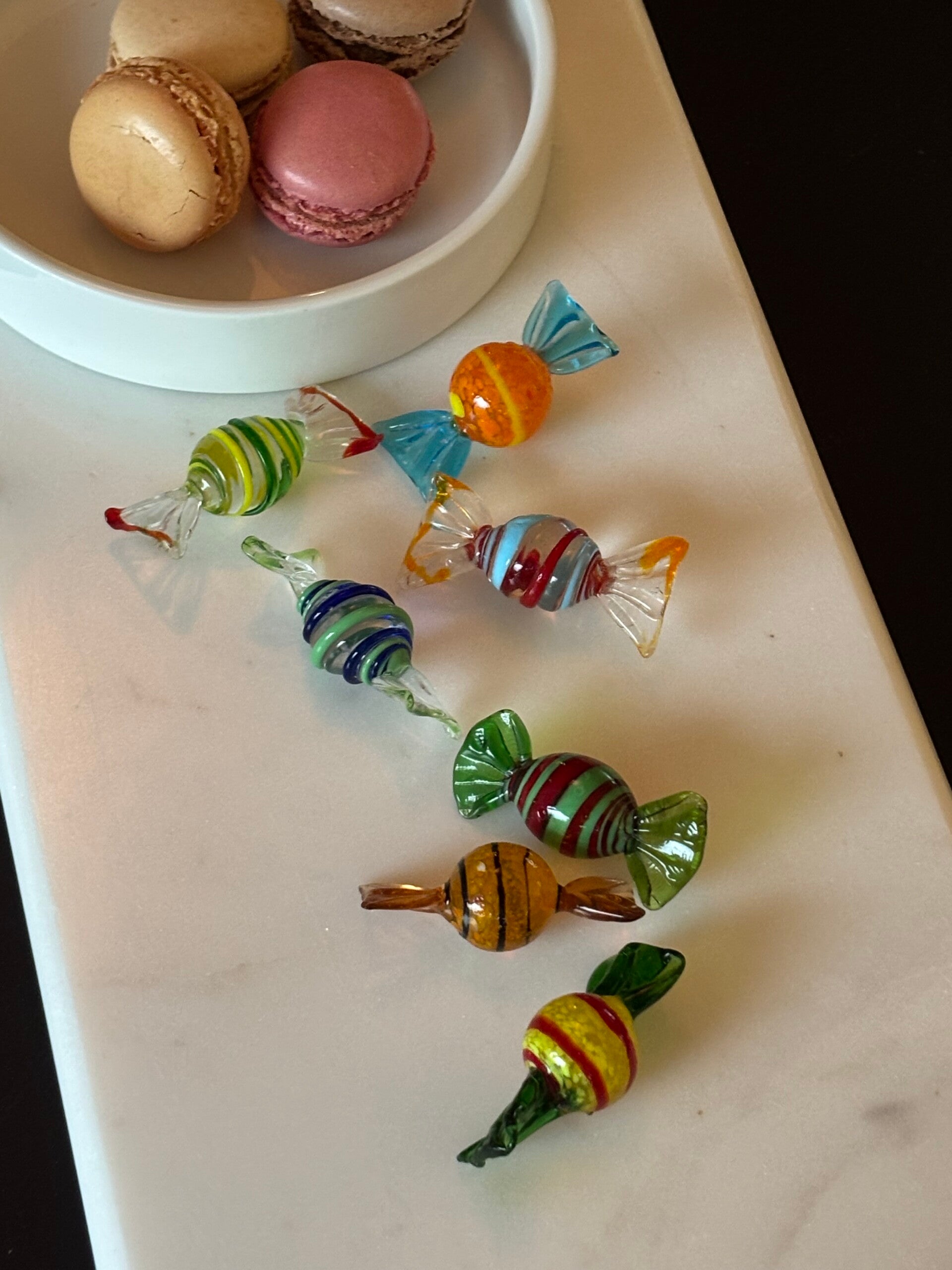 Set van 7 handgemaakte glazen snoepjes, een speels en verfijnd decoratief accent. Afkomstig uit Italië en met zorg vervaardigd. Prachtig in een schaal of vitrine. Afmetingen: ca. 5 x 2,5 cm.