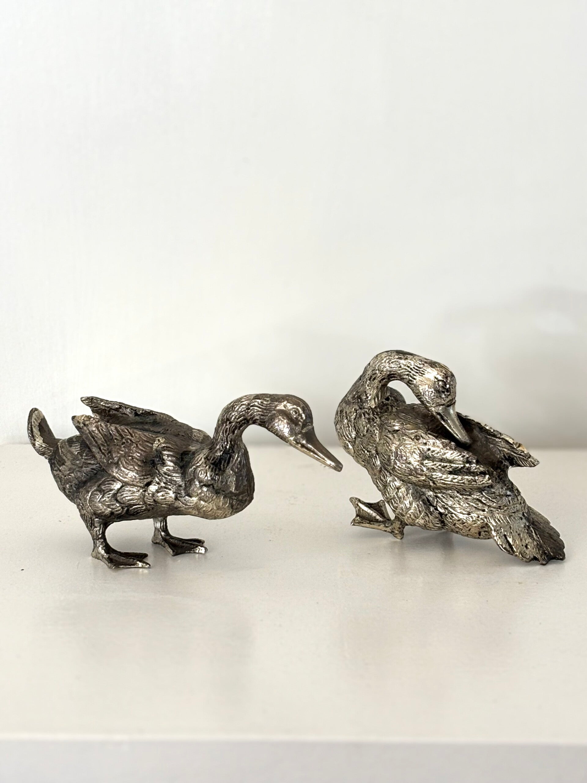 Set of silver-plated ducks, a charming and stylish decorative duo for table or sideboard. A refined accent with playful elegance. Dimensions: 16.5 x 8.5 cm and 12.5 x 9 cm.