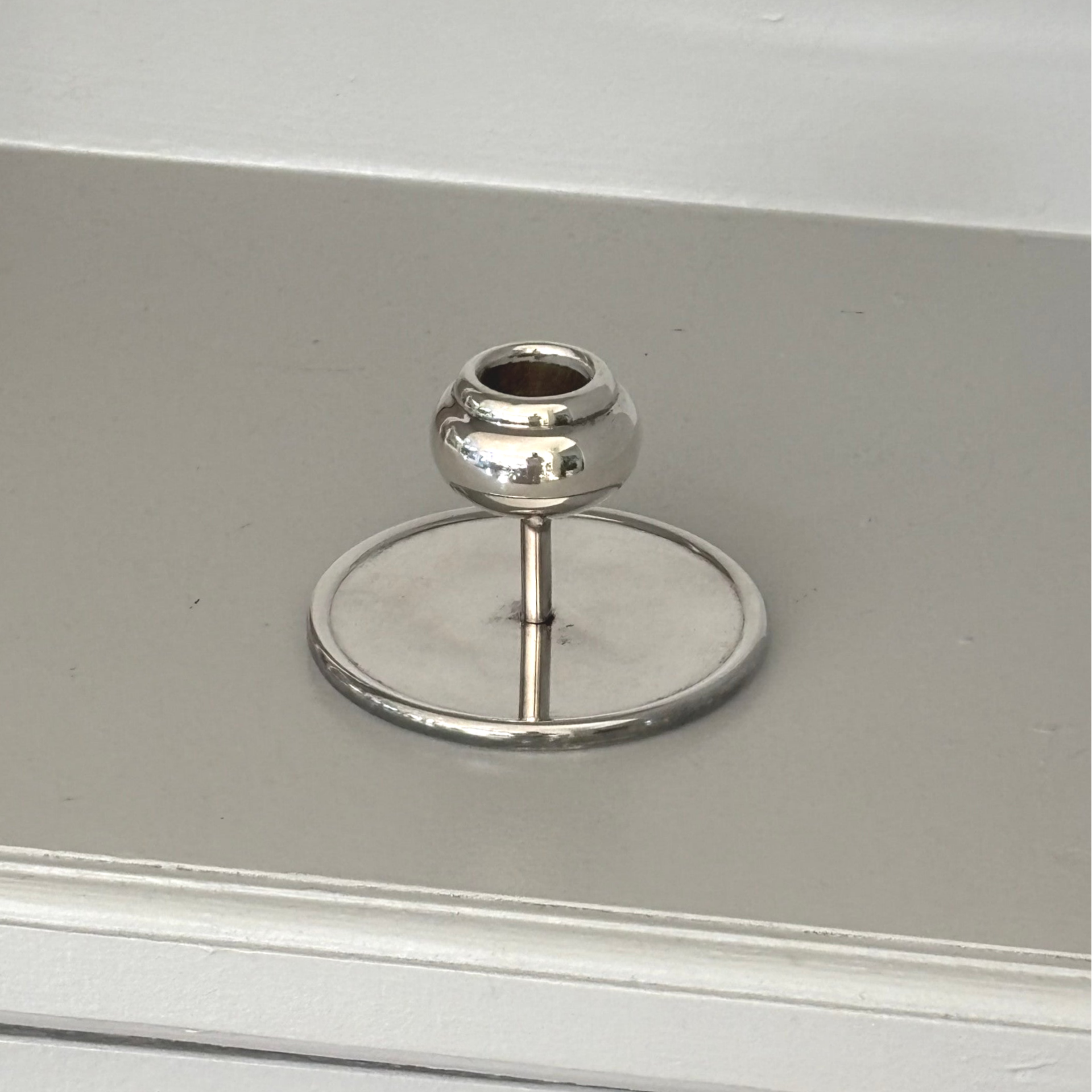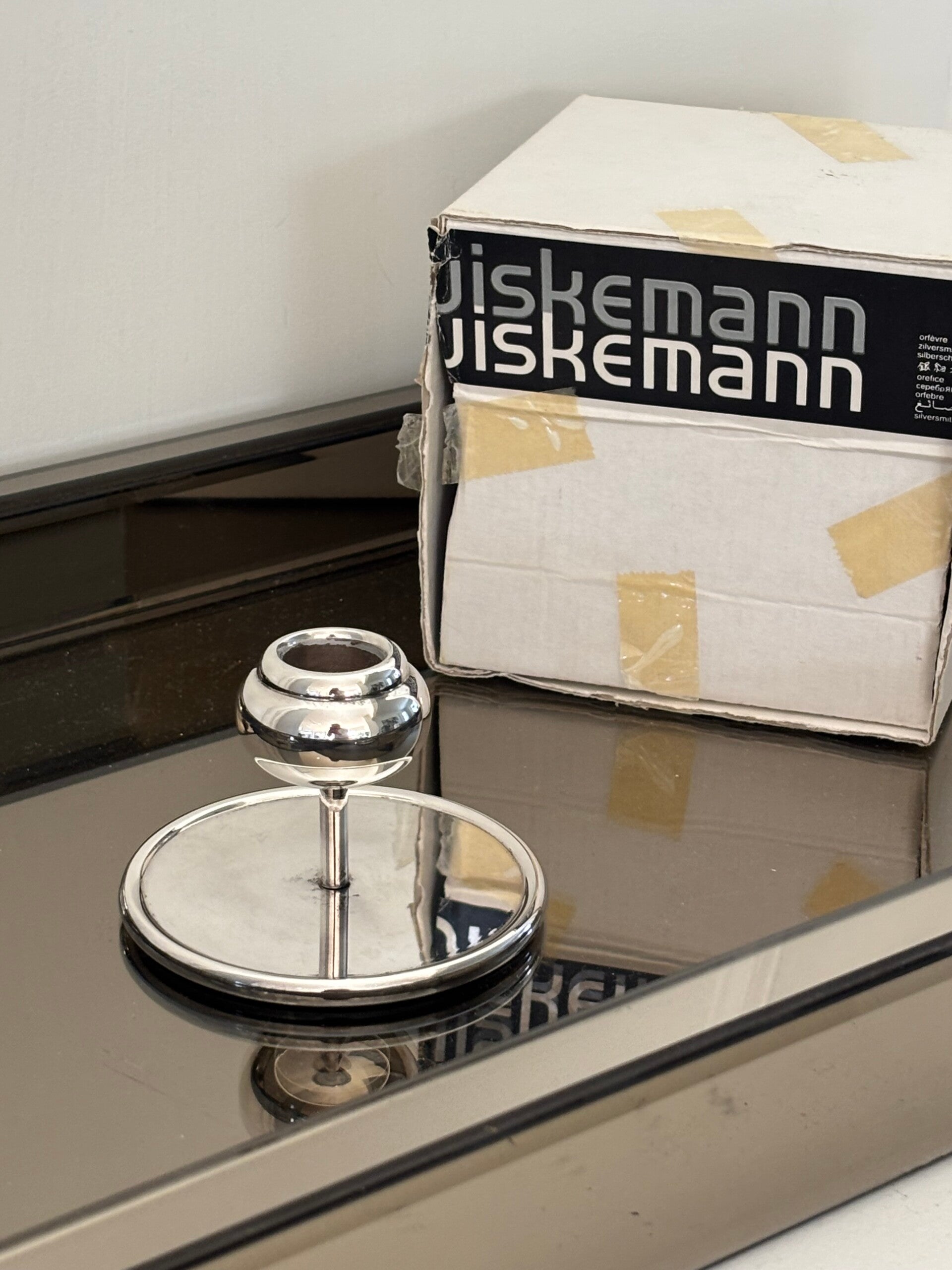 Heavy silver-plated candle holder by Wiskemann, marked on the underside and presented in its original box. In mint condition and radiating timeless elegance. Dimensions: 5.5 x 8.8 cm.