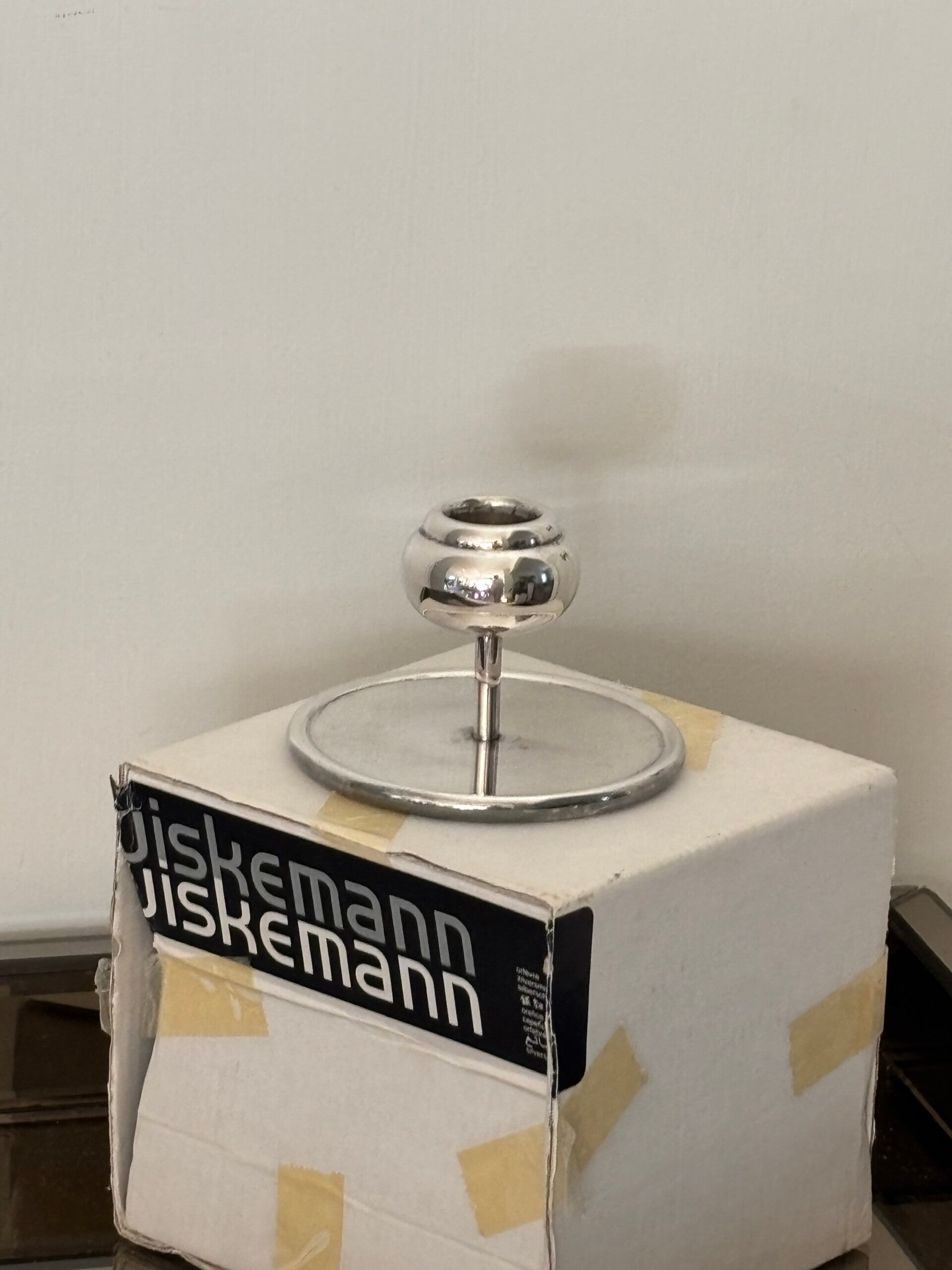 Zware verzilverde kandelaar van Wiskemann, gemerkt aan de onderzijde en in originele doos. Verkeert in nieuwstaat en straalt tijdloze klasse uit. Afmetingen: 5,5 x 8,8 cm.
