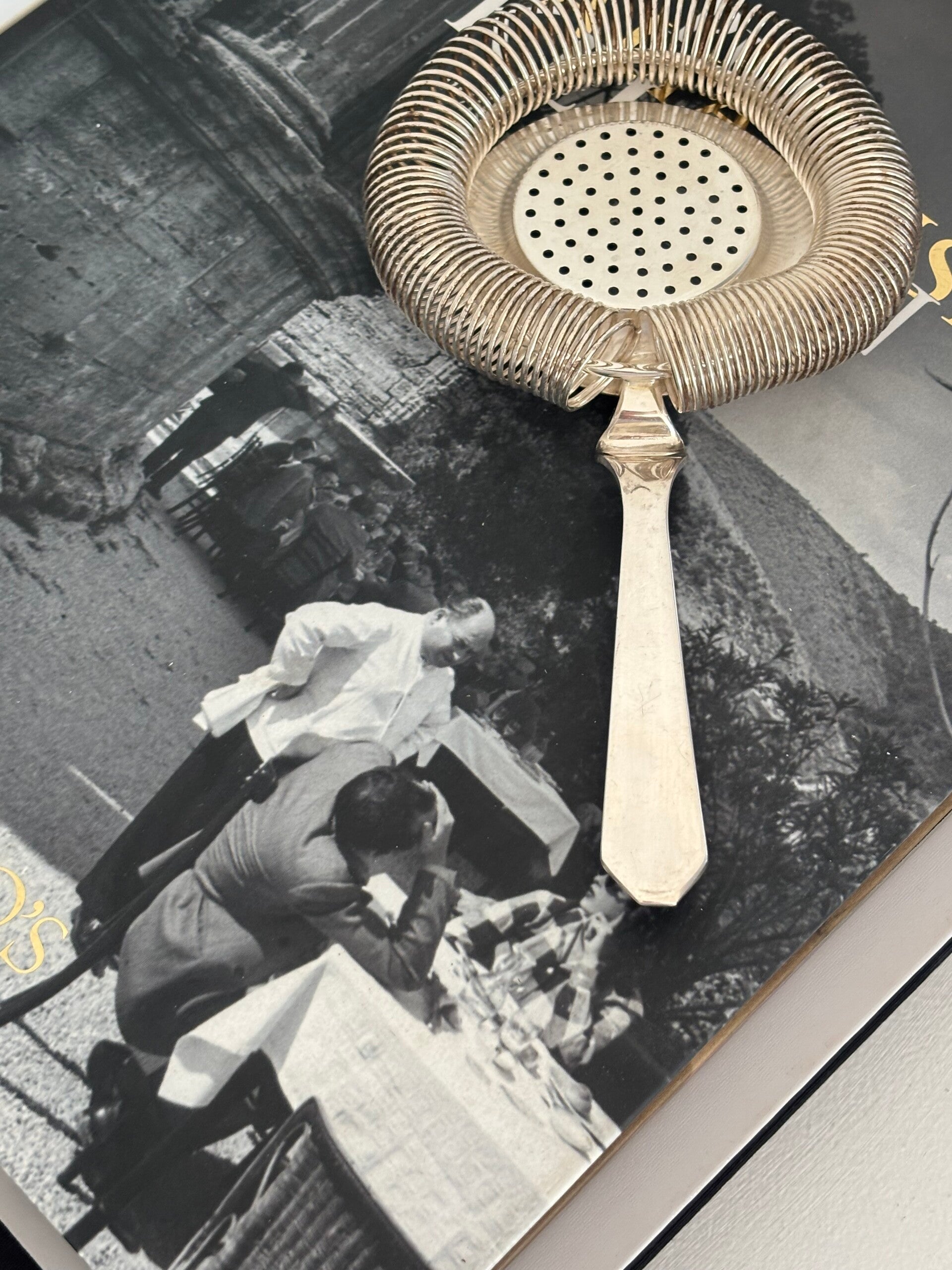 Verzilverde cocktailzeef, gemerkt aan de onderzijde en in mooie staat. Een elegant accessoire voor het stijlvol bereiden en schenken van cocktails. Afmetingen: 20 x 10,5 cm.