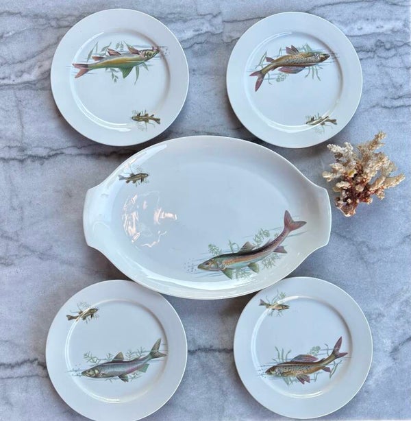 4-Person porcelain set consisting of 4 dinner plates (diameter 25.3 cm) and 1 large serving platter (44.3 x 30 cm). Each piece is beautifully decorated with fish, creating a refined and harmonious ensemble. An elegant showpiece on the table. Made in Spain.