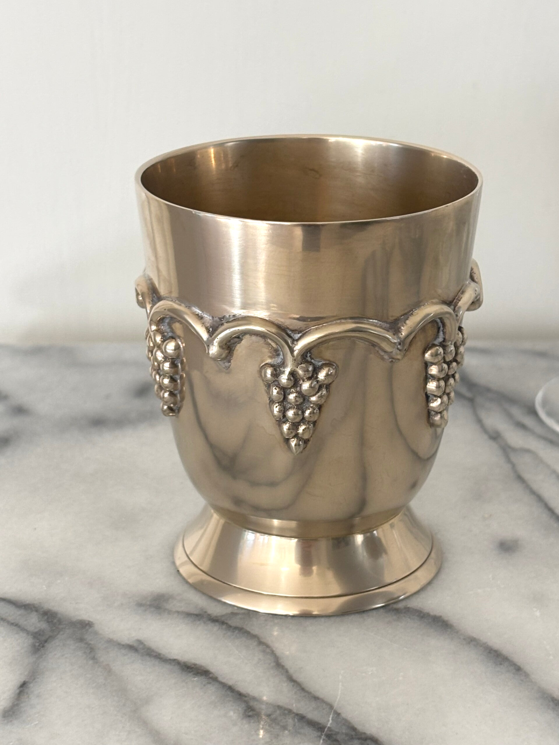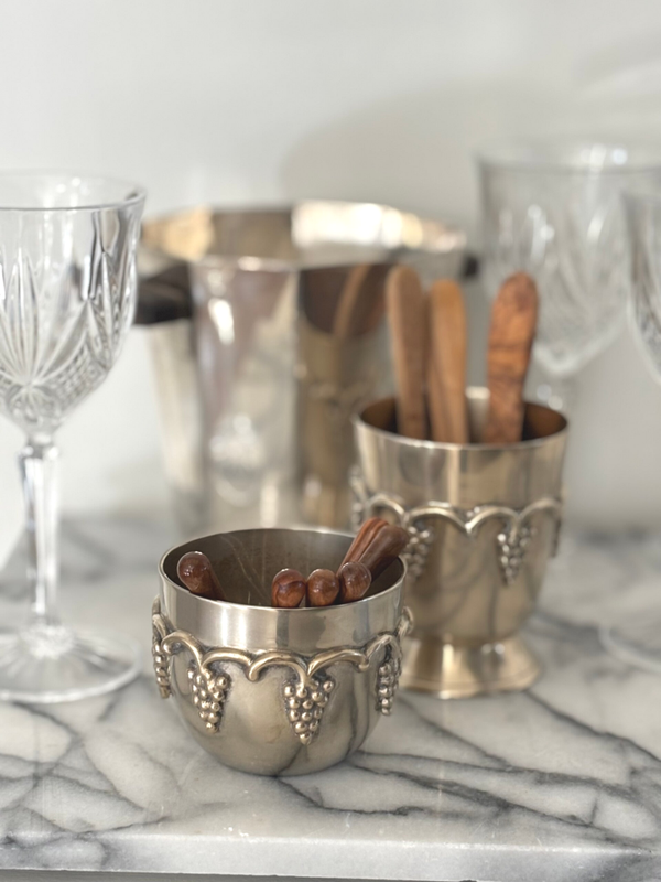 Beker op voet gedecoreerd met elegante druivenranken. Een charmant en stijlvol item, ideaal voor op de borrelplank om bijvoorbeeld vorkjes of tapasprikkers in te presenteren. Afmetingen: 9,2 x 8 cm.