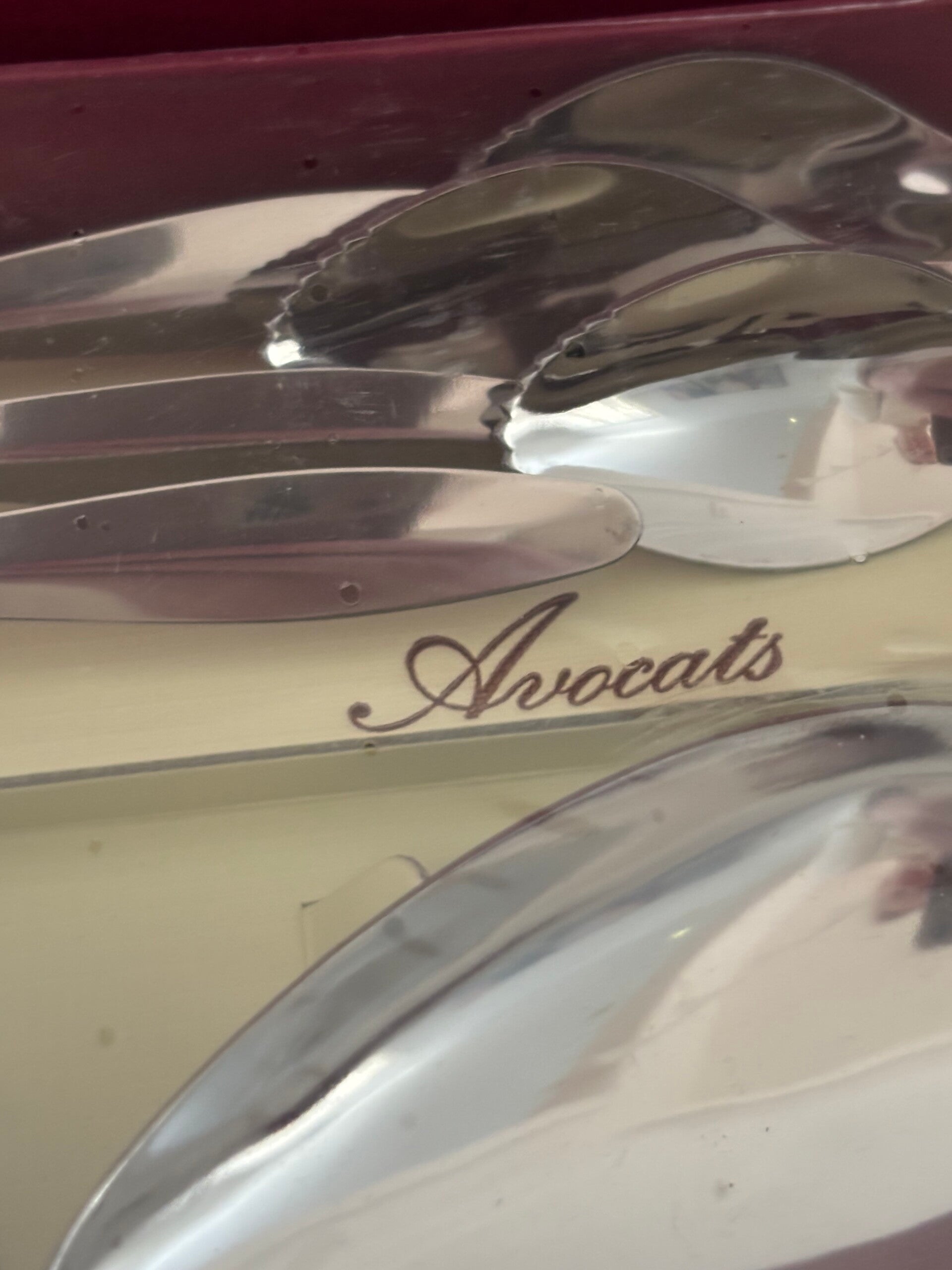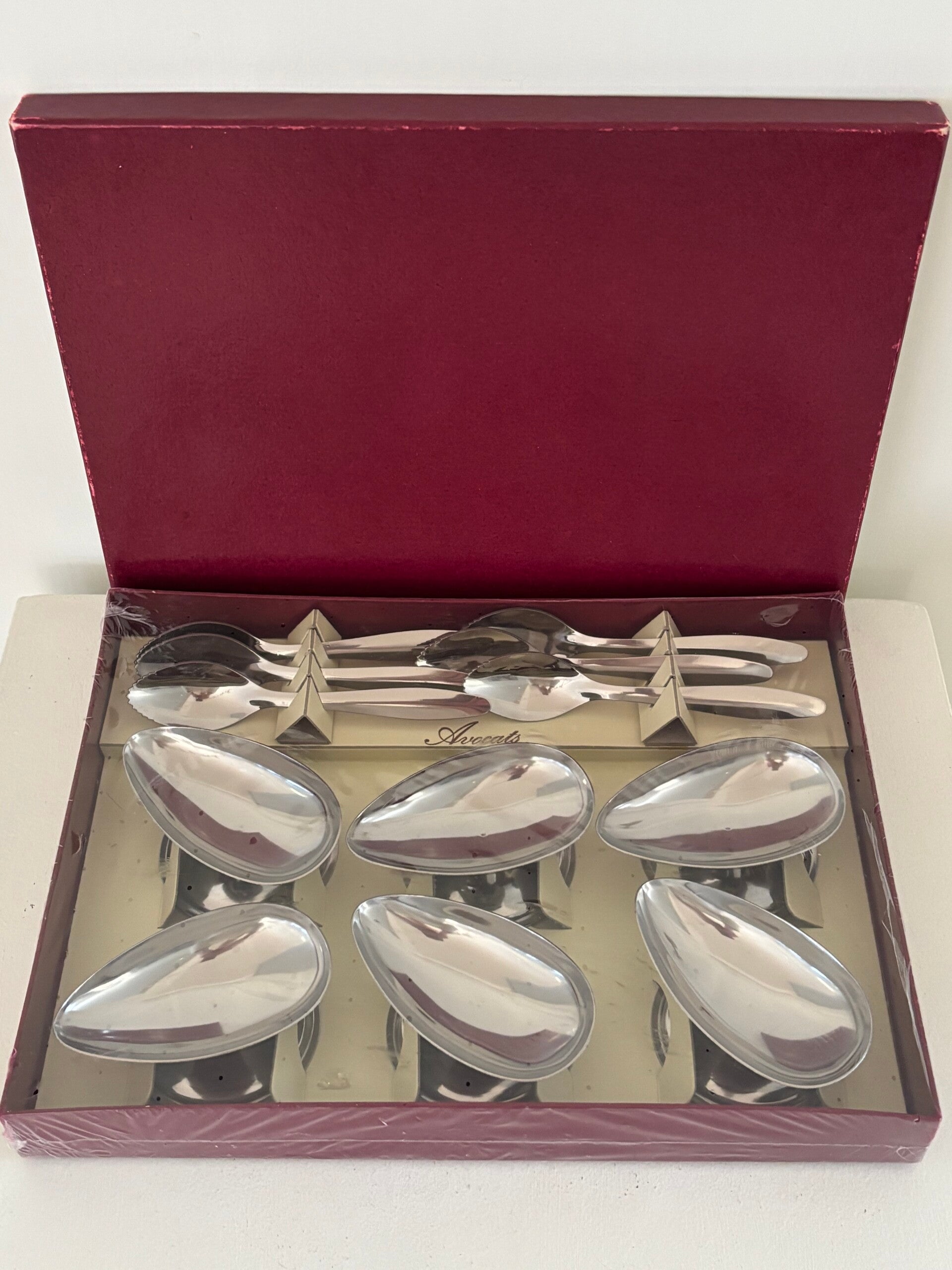 Set of avocado dishes with matching spoons. A charming and playful item, perfect for serving stuffed avocados in style.