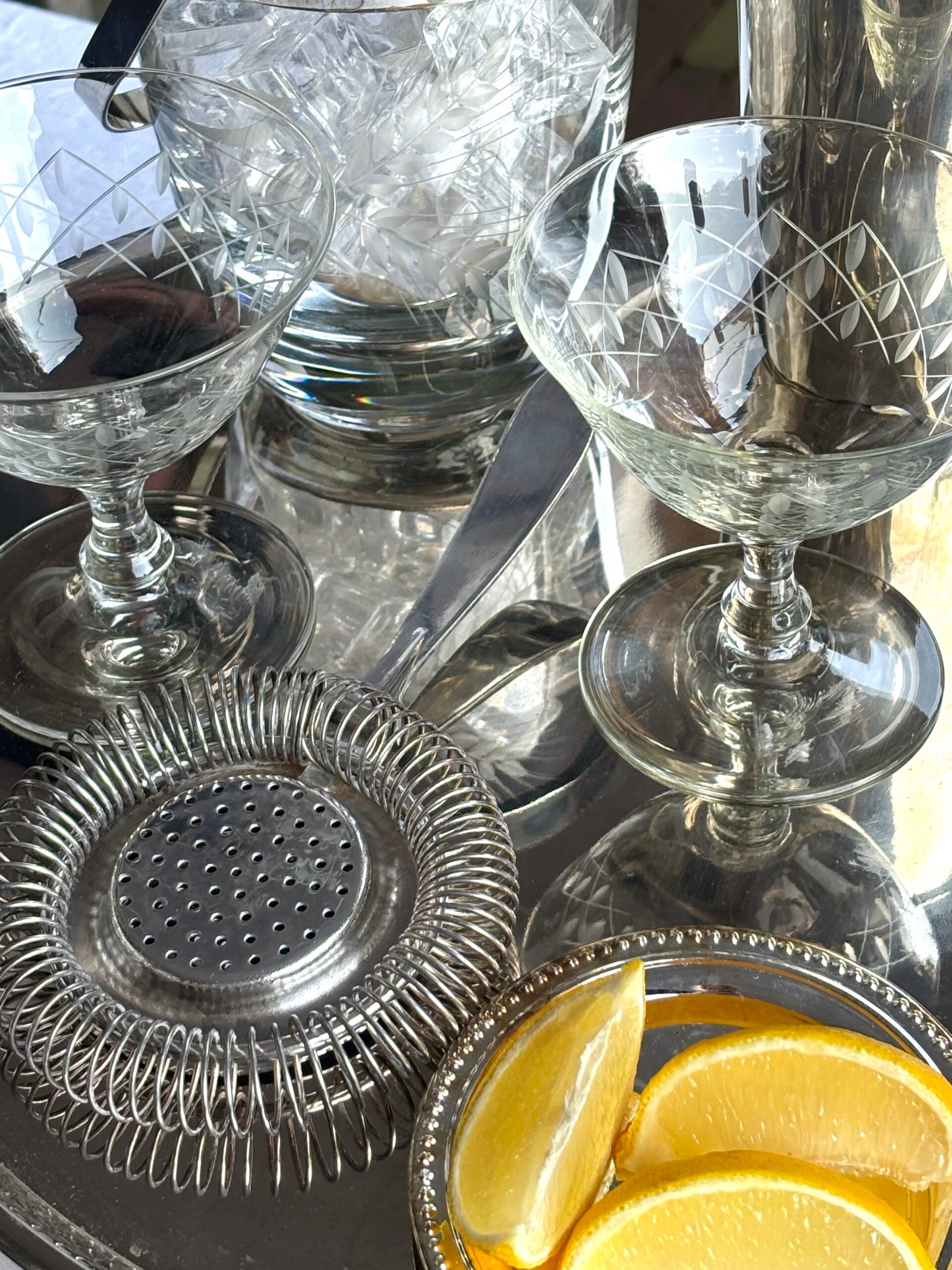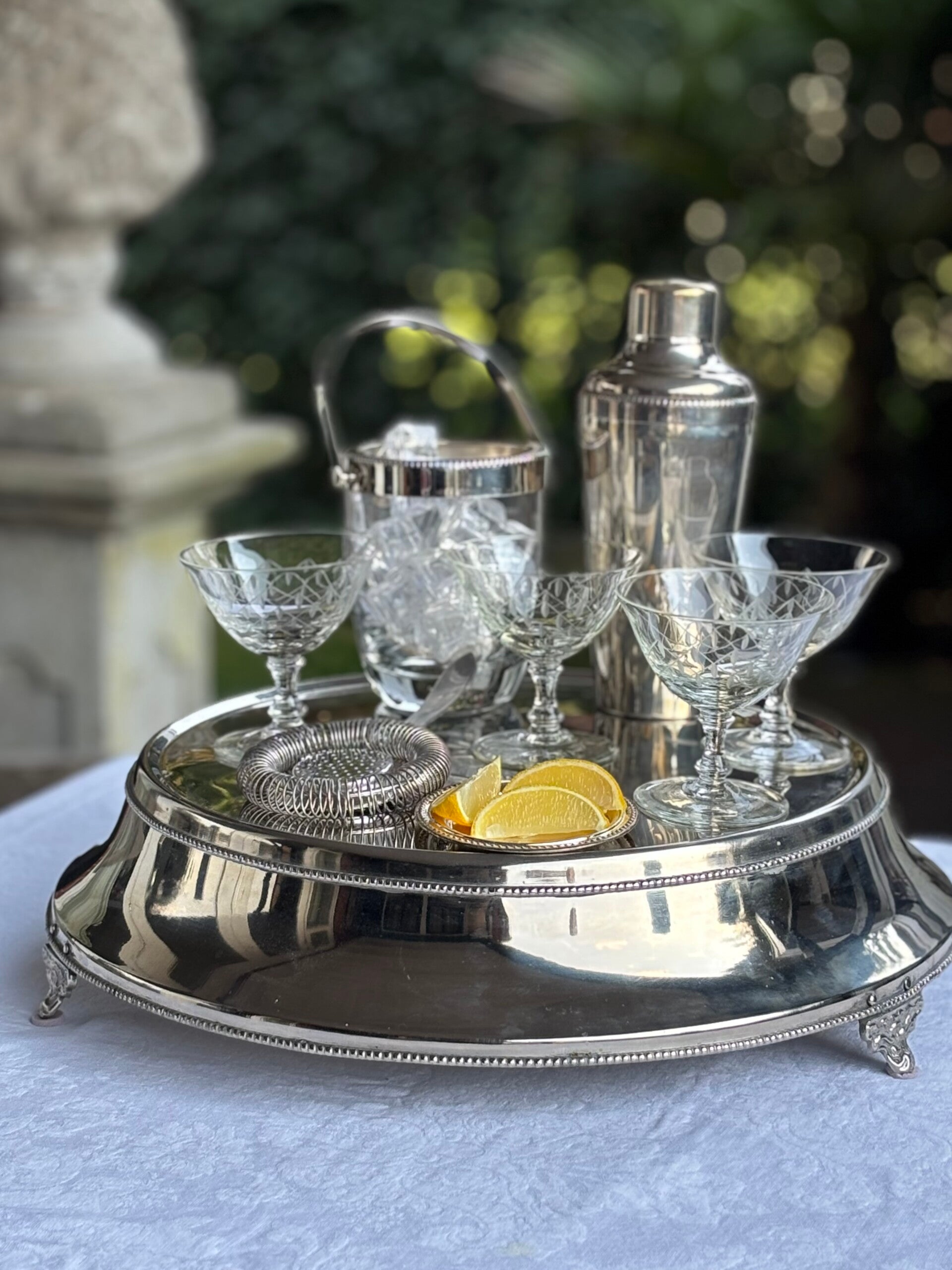 Cocktailset bestaande uit een verzilverde cocktailshaker, een verzilverde en handgeslepen ijsemmer, een verzilverde zeef, 4 geslepen coupes, een verzilverde onderzetter en een groot plateau. Een complete en stijlvolle set voor het serveren van cocktails.