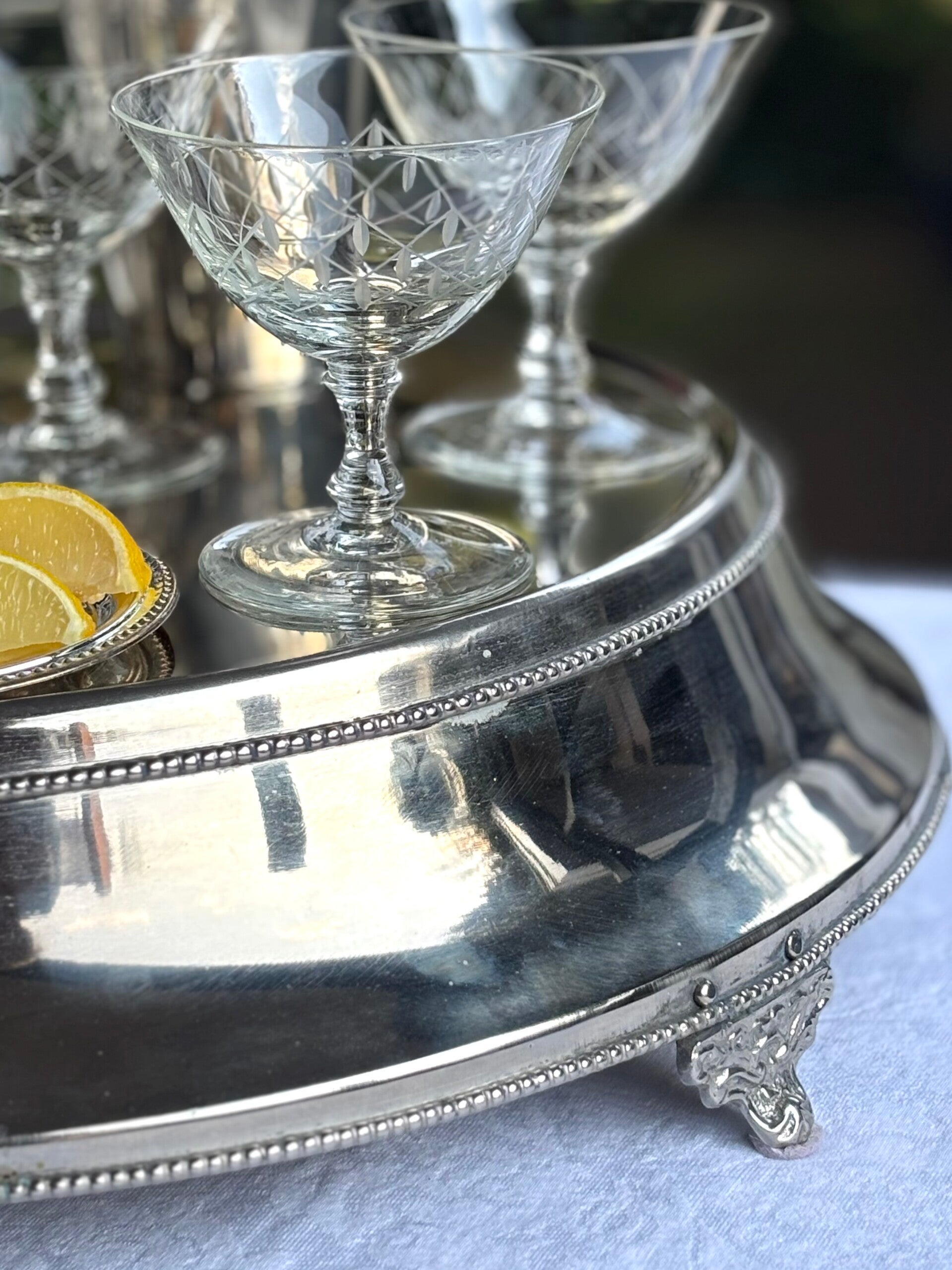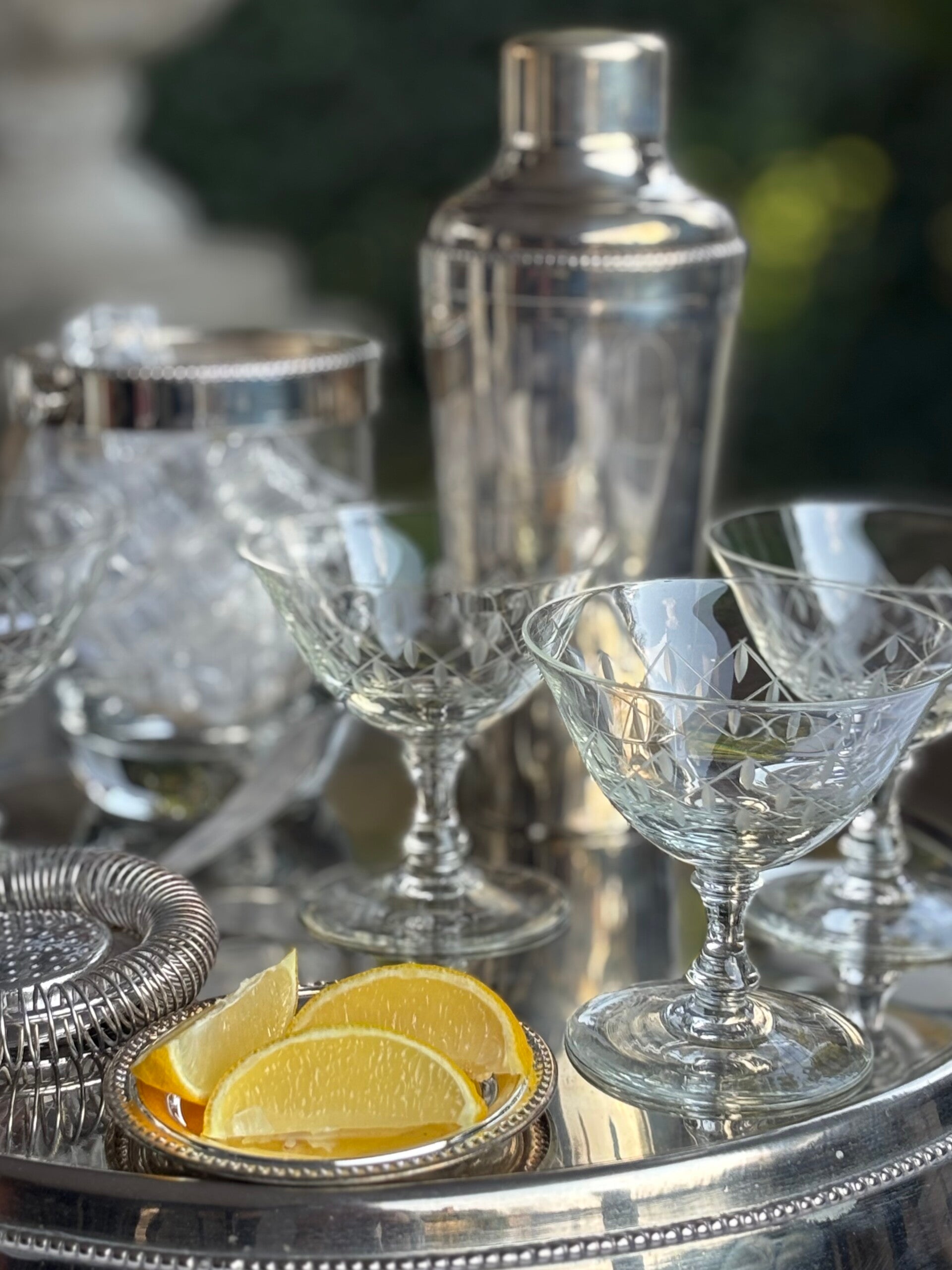 Cocktail set consisting of a silver-plated cocktail shaker, a silver-plated and hand-cut ice bucket, a silver-plated strainer, 4 cut coupes, a silver-plated coaster and a large tray. A complete and elegant set for serving cocktails.