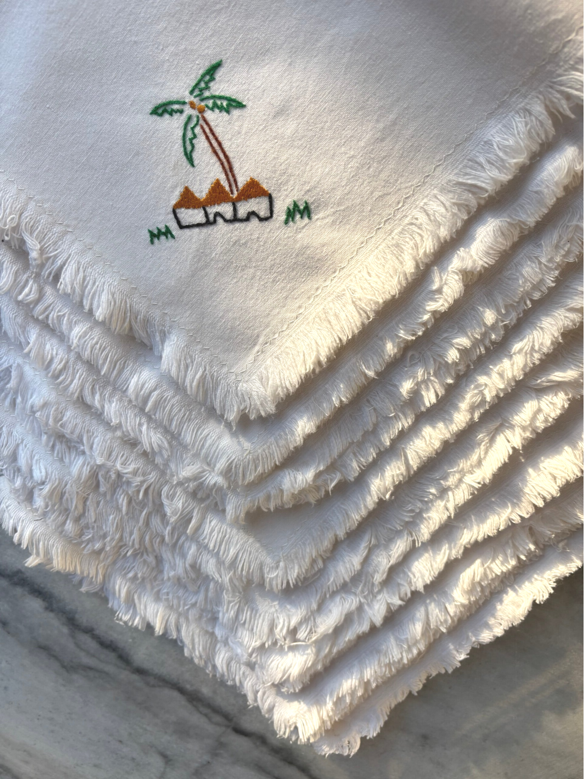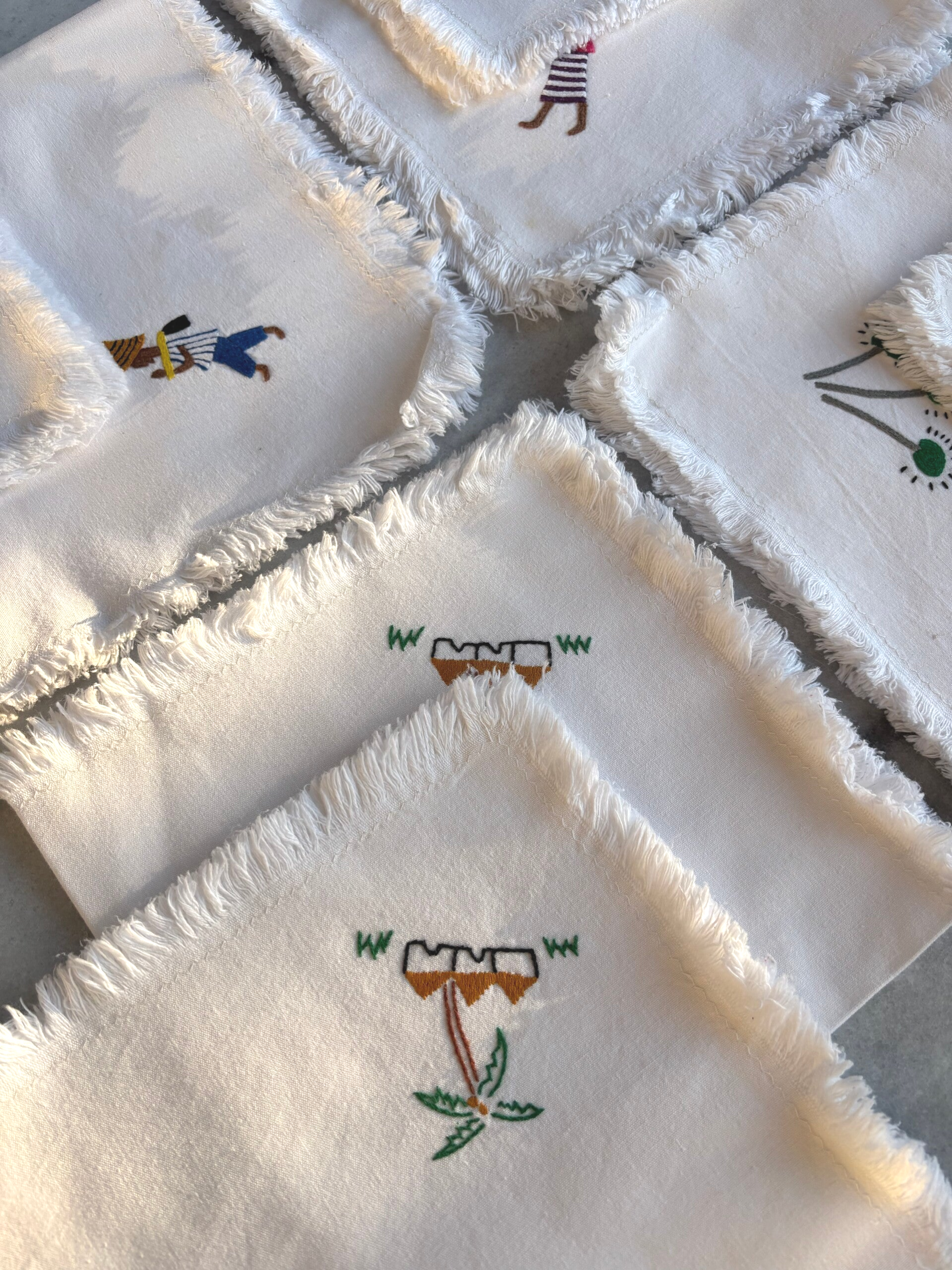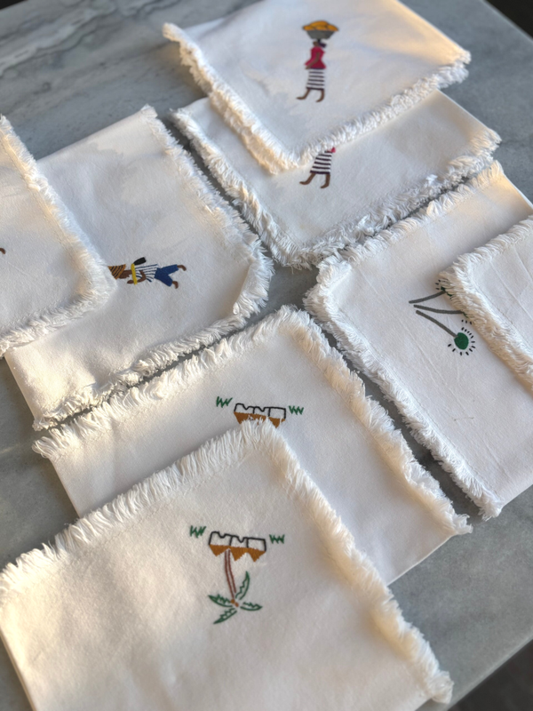 Set of 8 Jamaican napkins/placemats, handmade and beautifully decorated with embroidered figures and motifs. In lovely vintage used condition. A charming and characterful addition to a table setting.