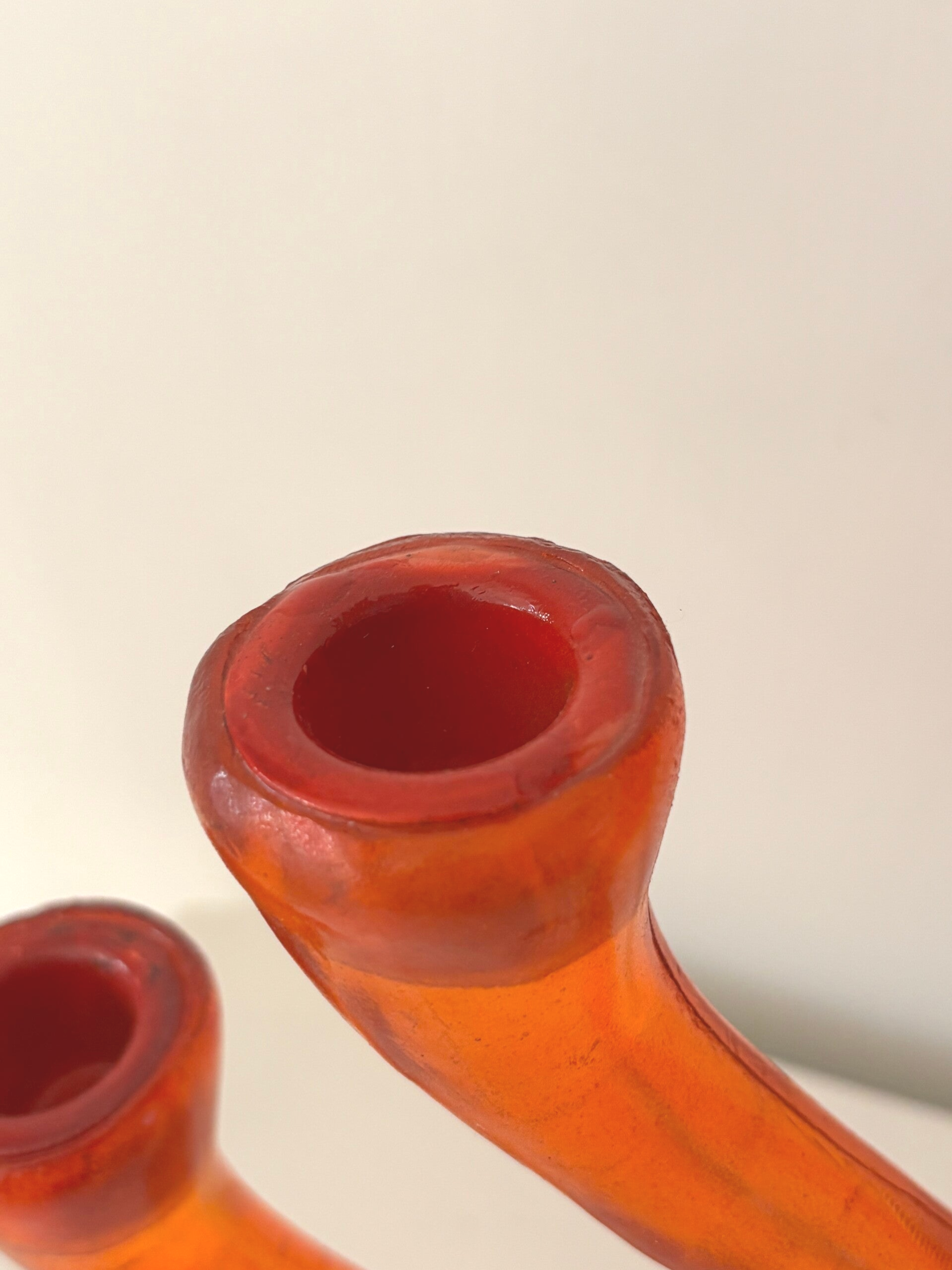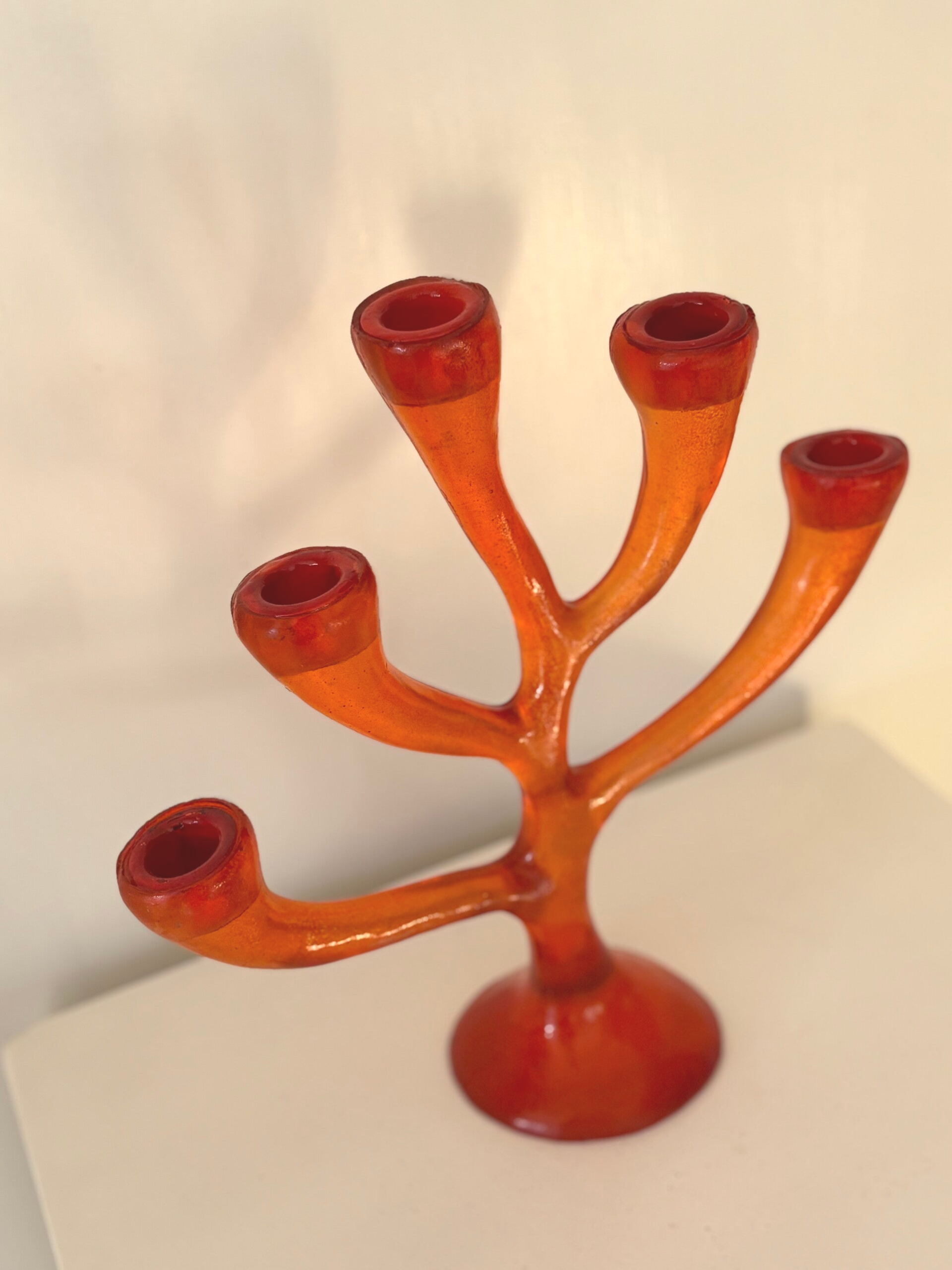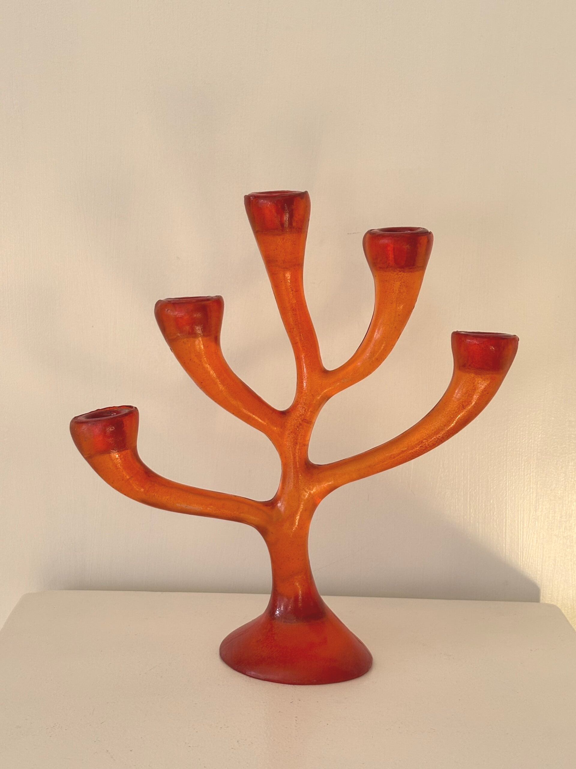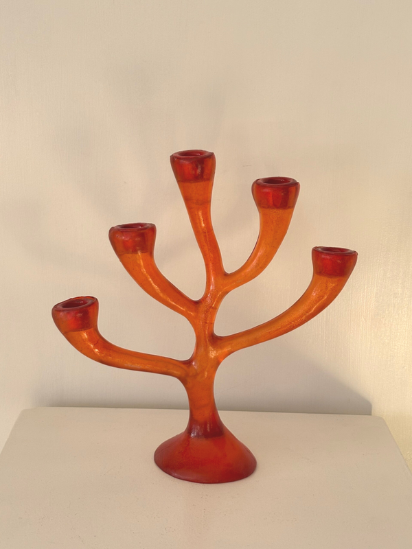 Five-arm candle holder from the 1970s in a rich deep orange hue. A striking vintage piece with a warm and characterful presence, perfect for adding atmosphere to any interior. Dimensions: 28 x 30 cm.