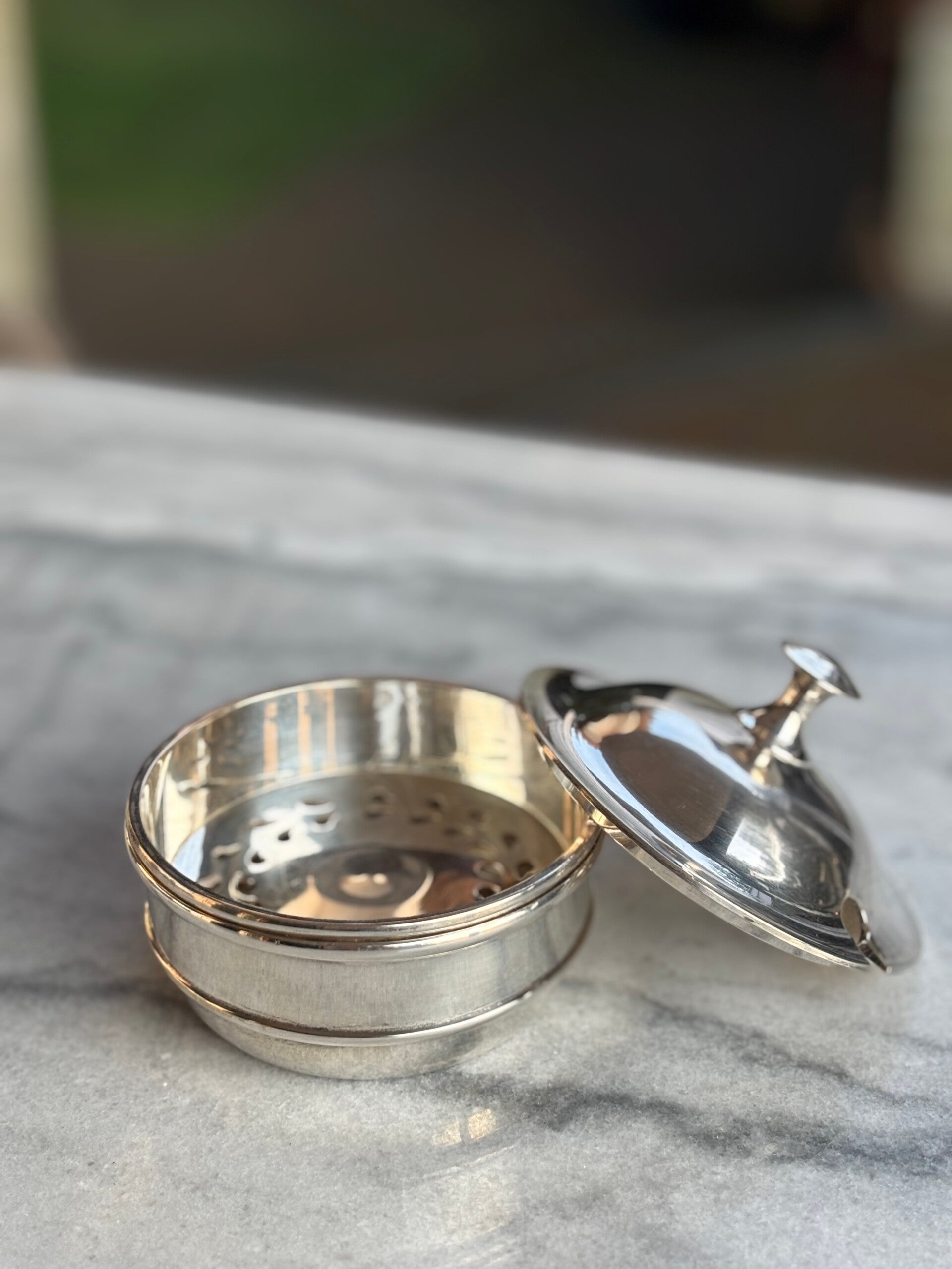 Verzilverde boterpers/koeler. Een stijlvol en functioneel item, een aanwinst op de gedekte tafel. Afmeting: cm.
