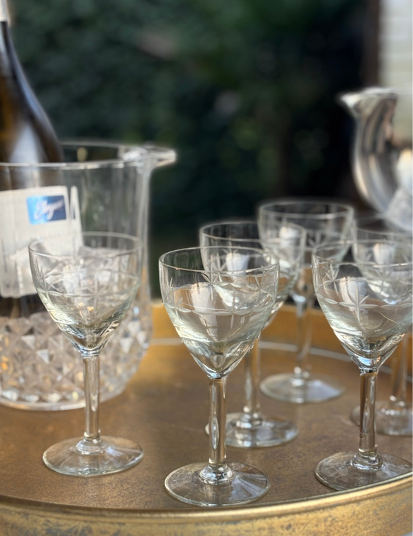 Set van 6 wijnglazen met prachtig geslepen motief. Een stijlvolle en tijdloze set voor feestelijke momenten. Diameter: 7,6 cm. Hoogte: 15,4 cm.