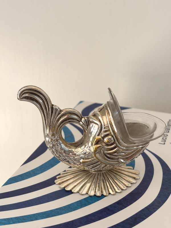 Silver-plated cocktail pick holder in the shape of a fish with plastic inlay. A playful yet stylish piece, perfect for a drinks platter.
