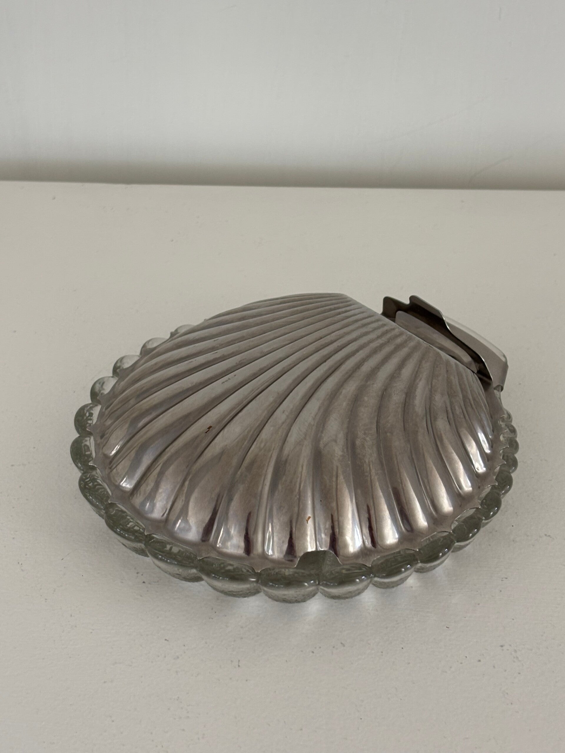 Elegant butter or caviar shell with glass base and metal lid. Slightly larger than a standard butter shell. Dimensions: cm.