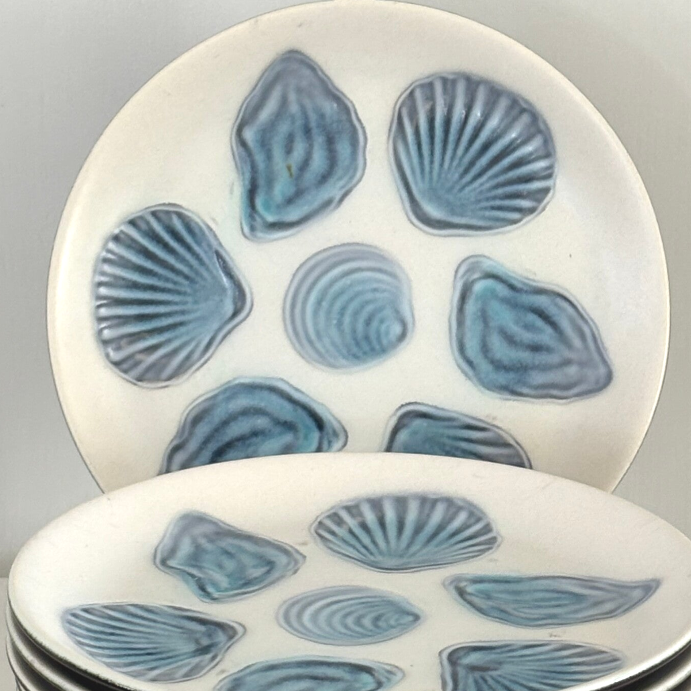 Set van 11 Franse oesterborden van keramiek. Decoratief en perfect voor het stijlvol serveren van oesters of amuses. Diameter: 24,5 cm. Een elegante toevoeging aan tafel.