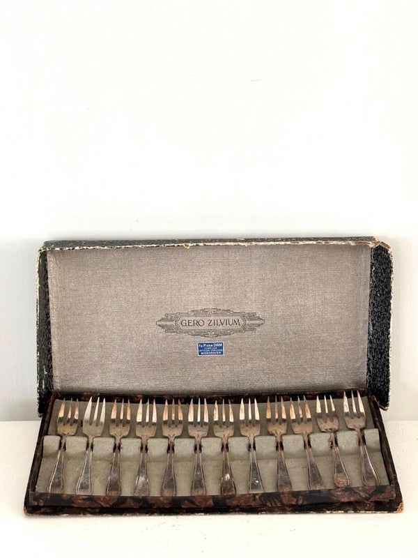 Set of 12 silver-plated forks by Gero Silvium . Elegant and perfect for desserts, pastries, or small bites. A classic and stylish addition to your table.