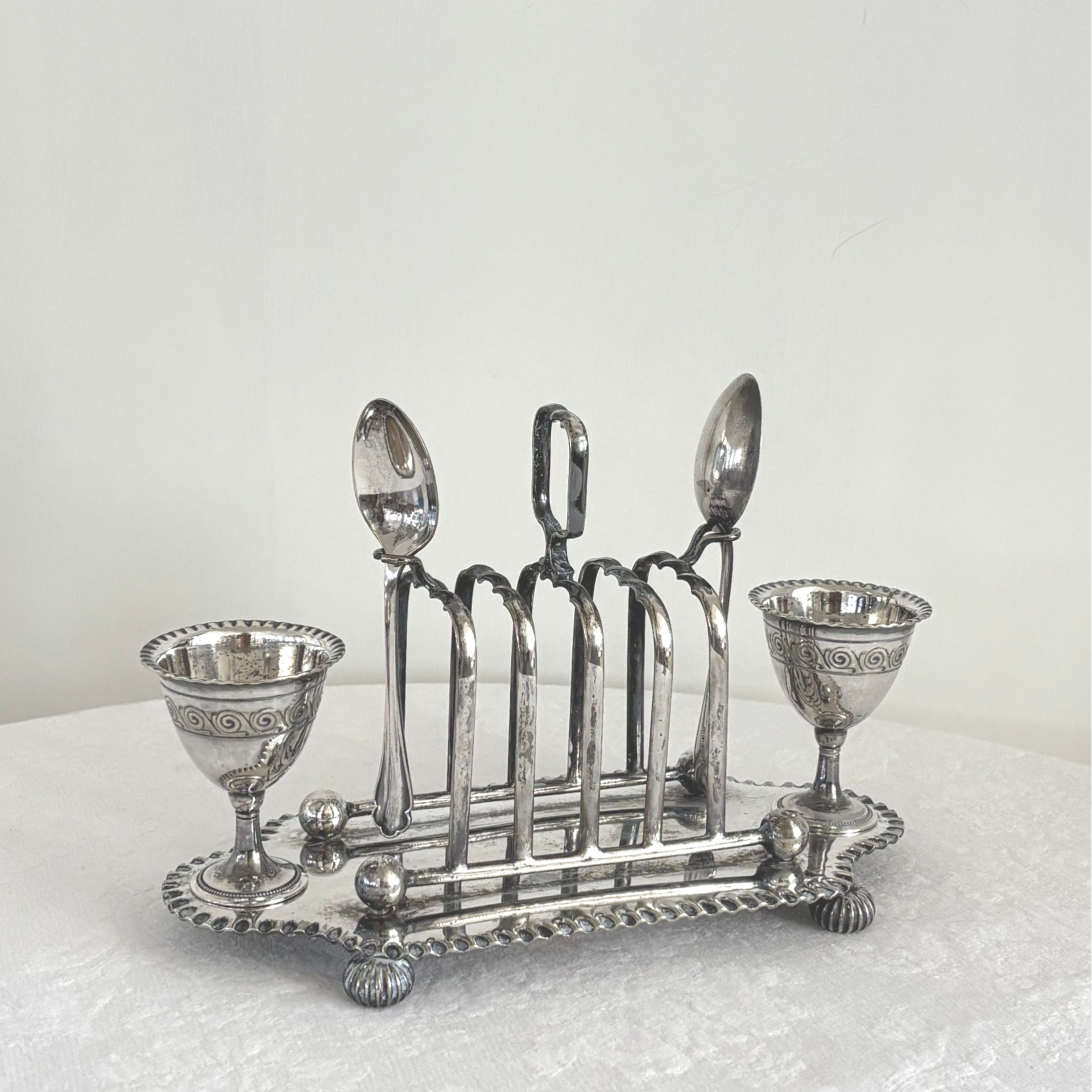 Silver-plated English egg holder set. Marked on the underside and on the spoons. With a beautiful patina, can be further polished if desired. Dimensions: 23 x 15 cm. An elegant and classic table piece.