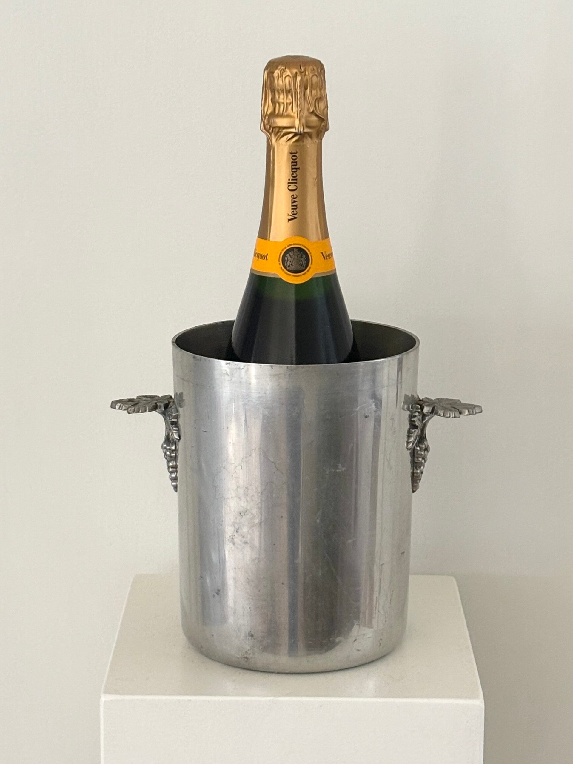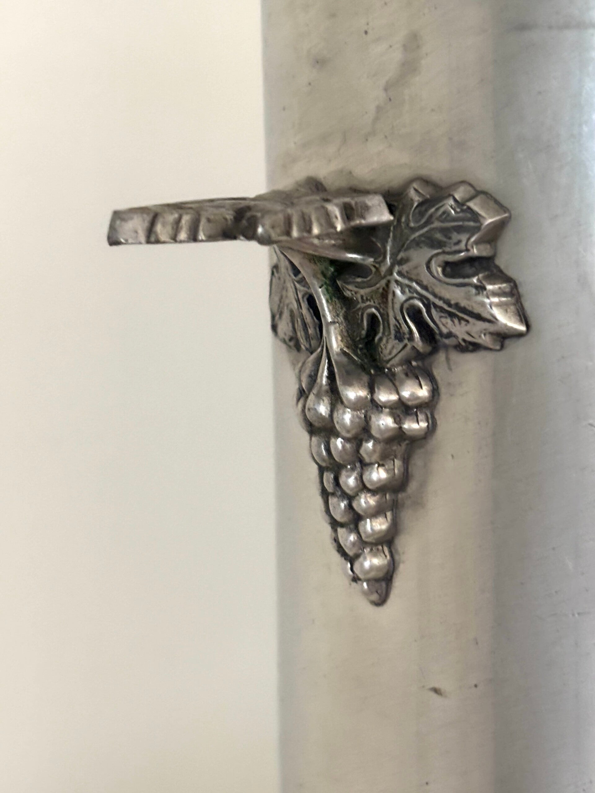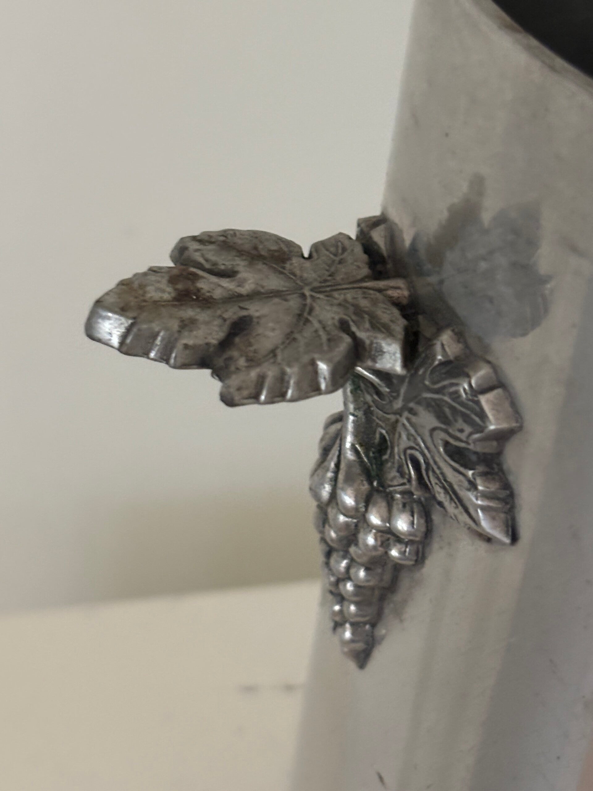Vintage wijnkoeler met handvatten in de vorm van druiventrossen. Een mooi zwaar exemplaar met klassieke uitstraling. Afmeting: 13,5 x 17 cm.